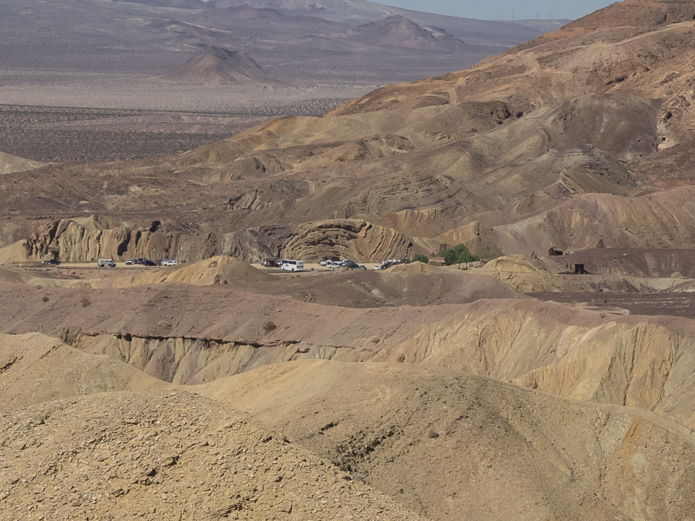 the crest of the ridge we could see the parking lot at Calico and