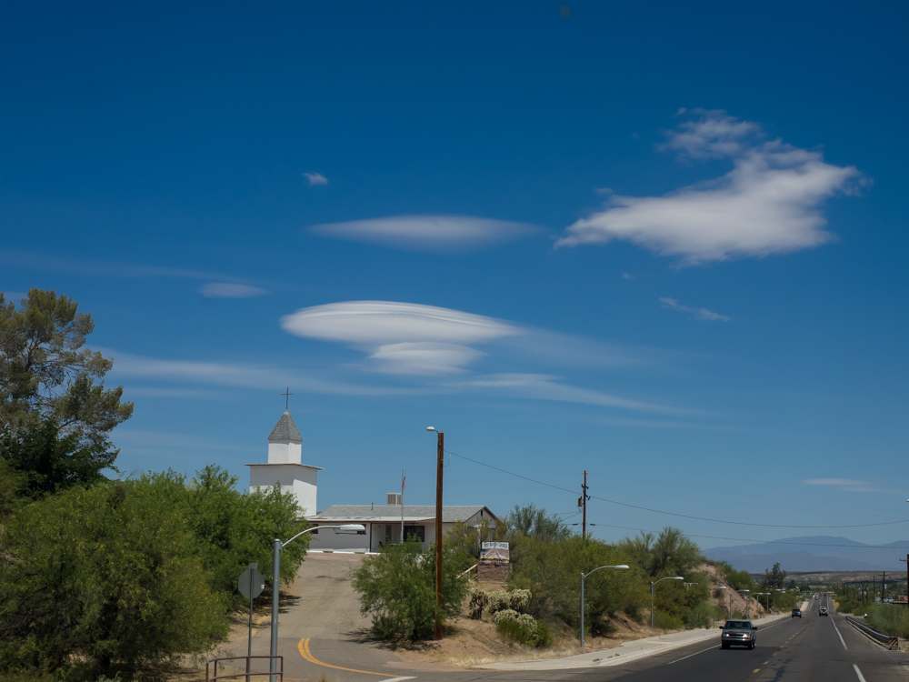 a set of lenticular clouds over the mountains to the north.