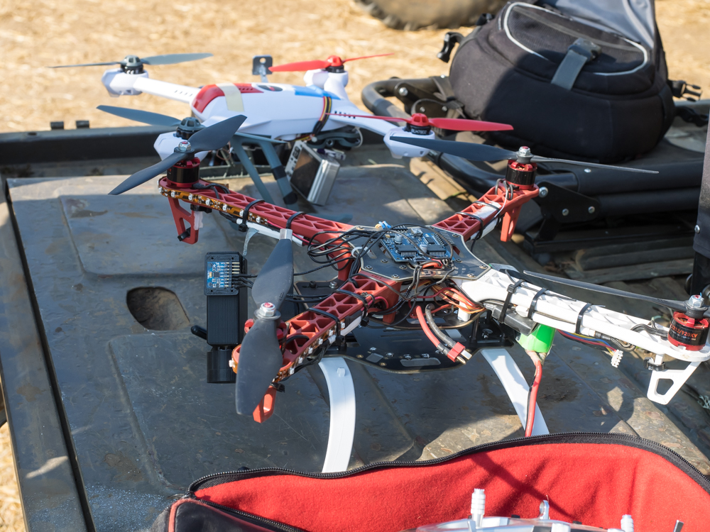 foreground is a DJI Flame 450 kit with a home-built gimbal.