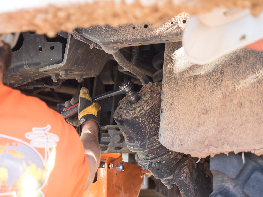 has jacked up his truck to support the removal of the tire.