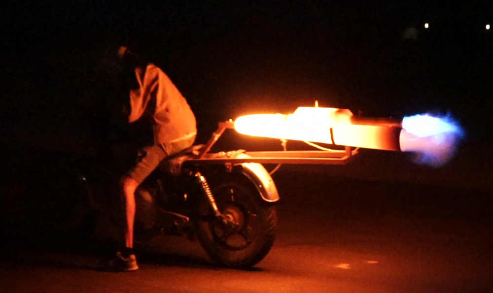 The boys examine the mechanical monstrosity called the rocket bike.  The engine has to be mounted well aft of the operator due to the intense heat generated during operation.  The whole setup is "hillbilly deluxe", but it DOES work.  The engineering design that went into the engine was impressive, almost as impressive as the effort put into the seat.