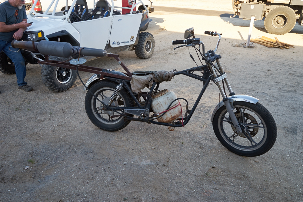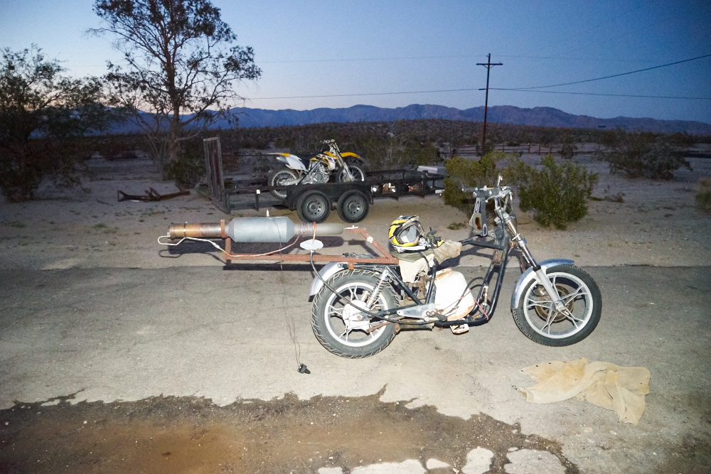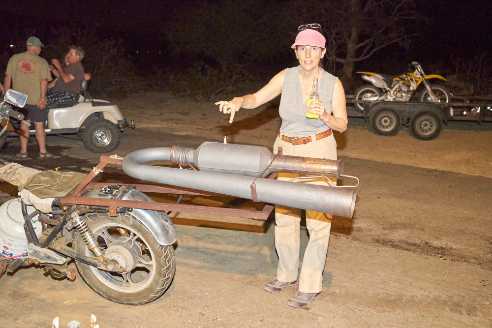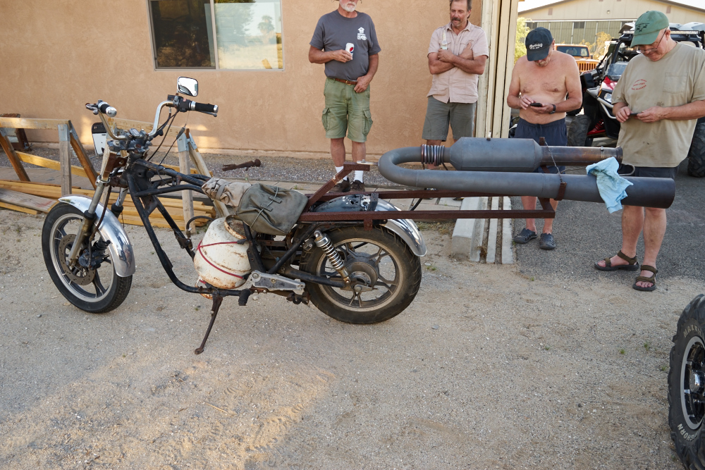 I met Tim through a long-time buddy of mine, Kai.  Tim is a jet turbine engineer and used a CAD/simulation program to design a valveless pulse jet engine.  He described its operation during an off-road trip last year, but I had never seen the engine in operation.  But a test run was being conducted in Borrego Springs, so we loaded up Thor and headed to watch.  The engine has  been mounted to an old motorcycle frame and attached to a 30lb propane bottle in preparation for a test run.  We had trouble getting it started due to low fuel, but once a new bottle was attached, it started right up.  There is a link to a youtube posting about 1/2 way down in this page.