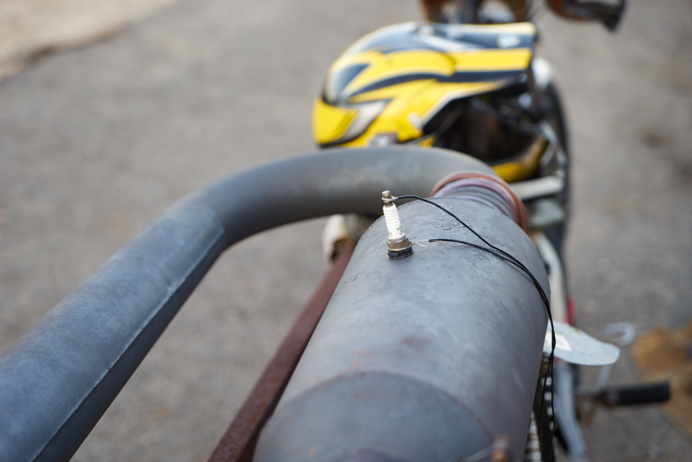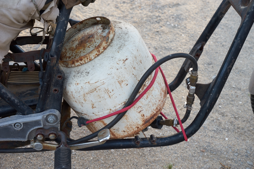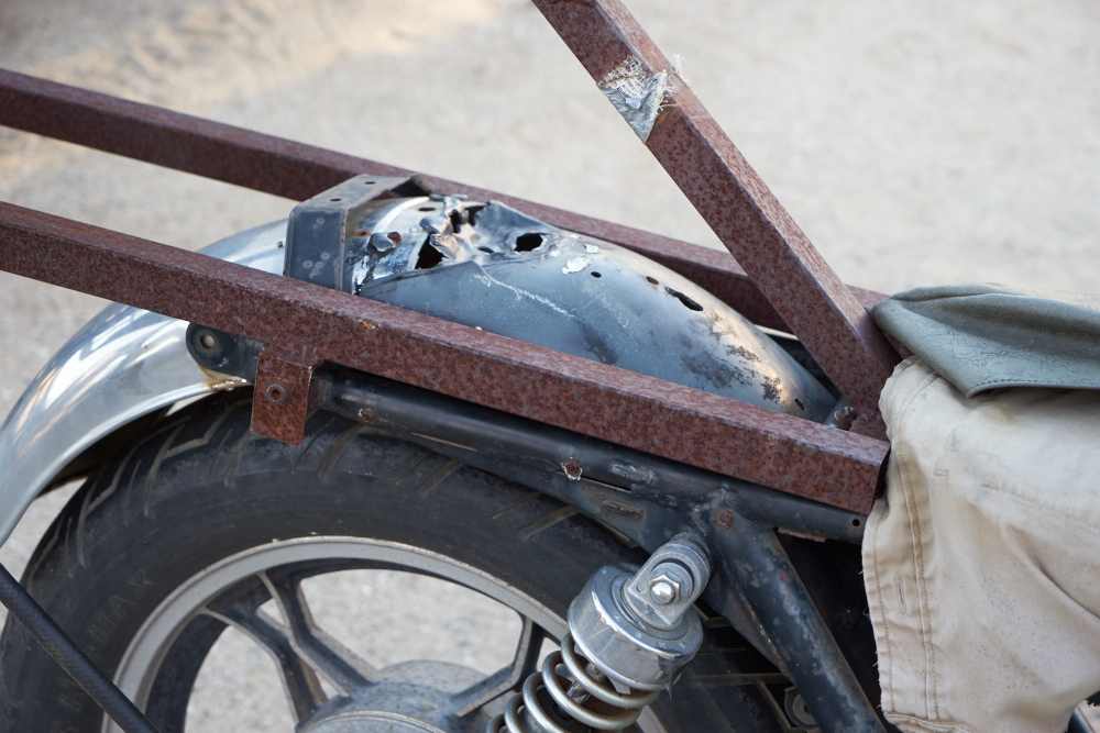During a previous run, the mounting bracket on the engine broke on rough ground and the engine fell onto the rear fender and melted the sheet metal!