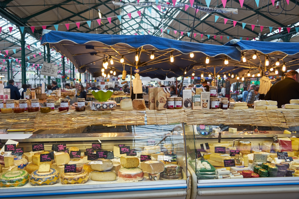 were large displays of cheeses and preserves.