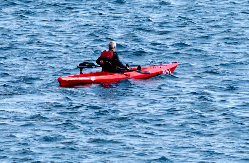 in the bay in his sea kayak.