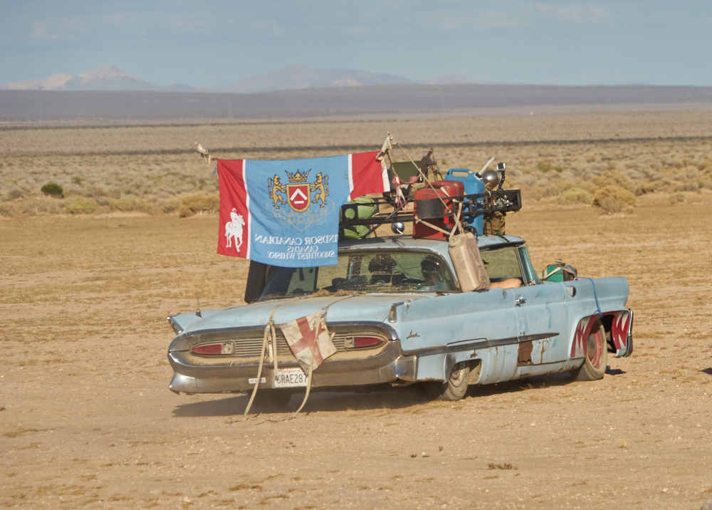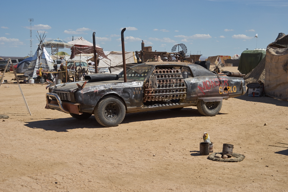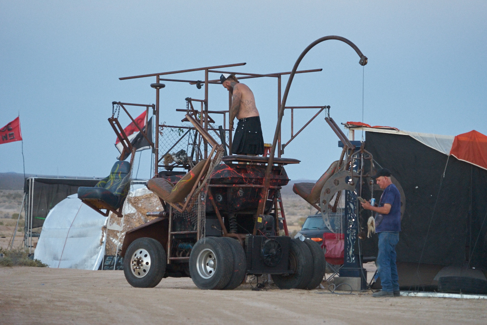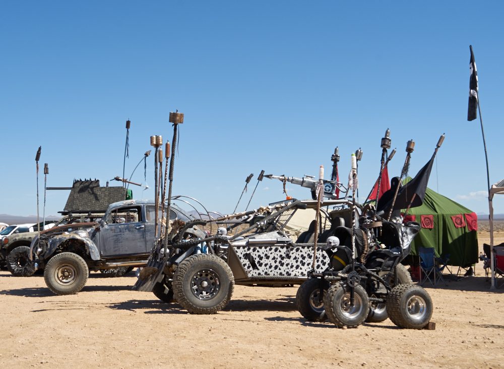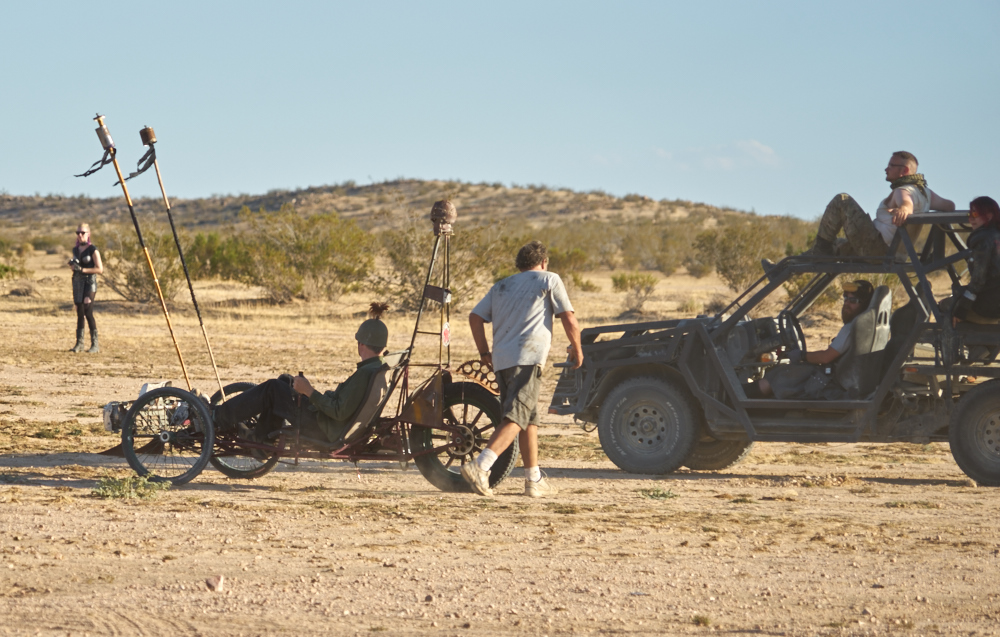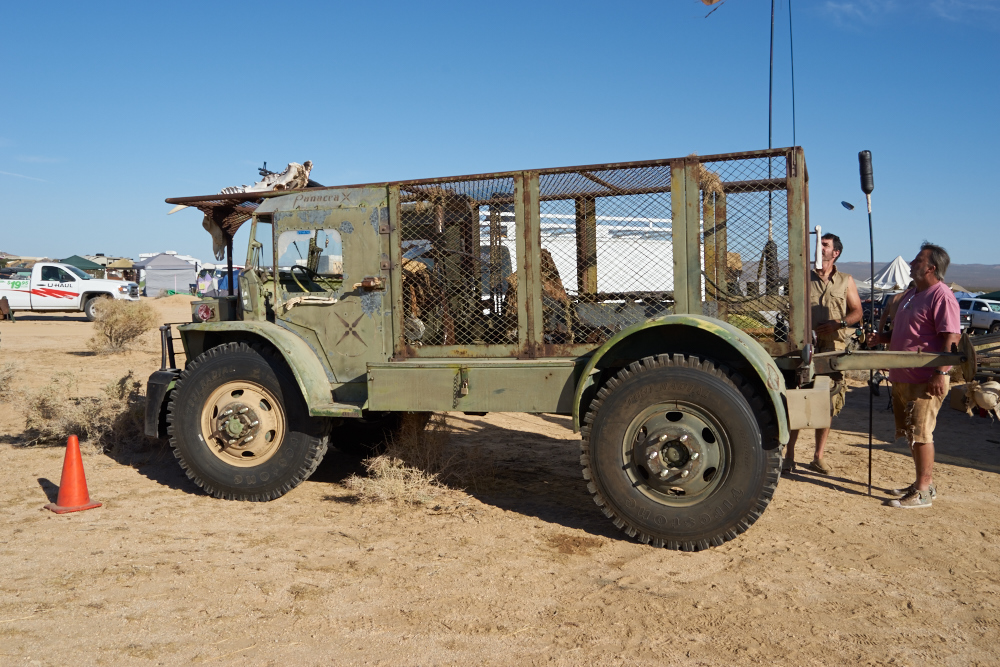 a very odd vehicle with hanging seats and a rear grappling hook.