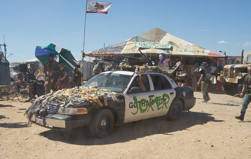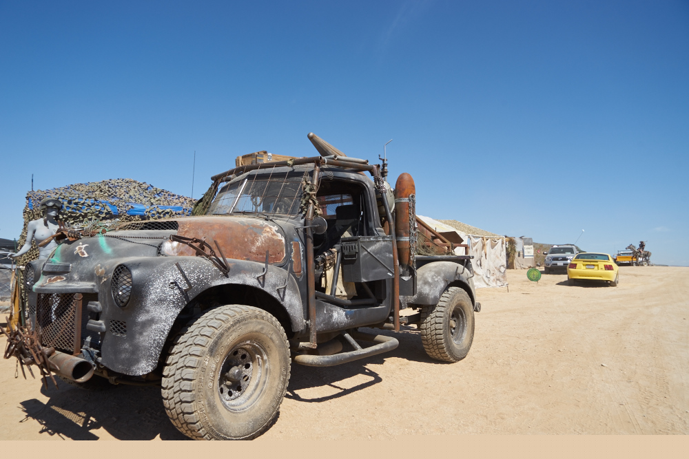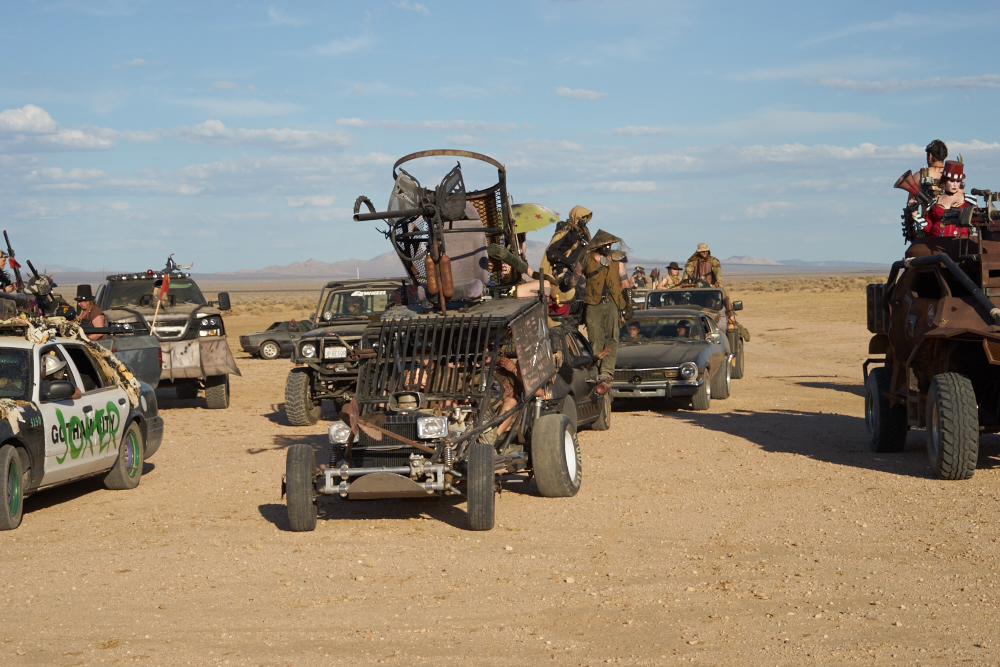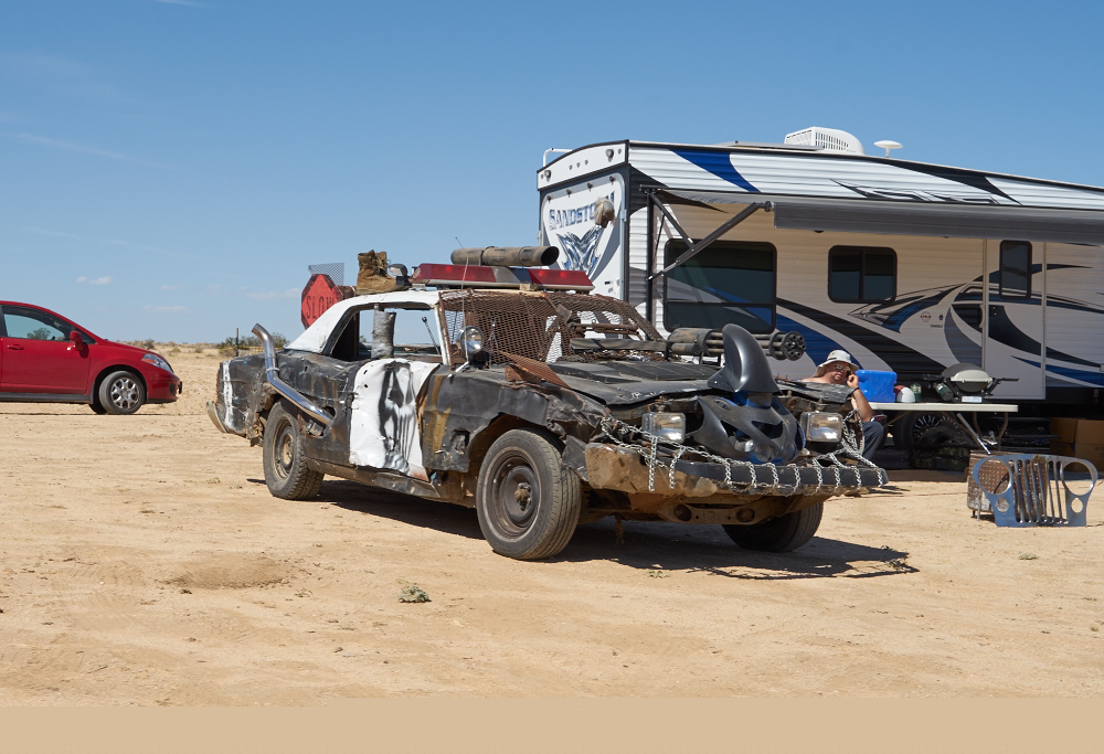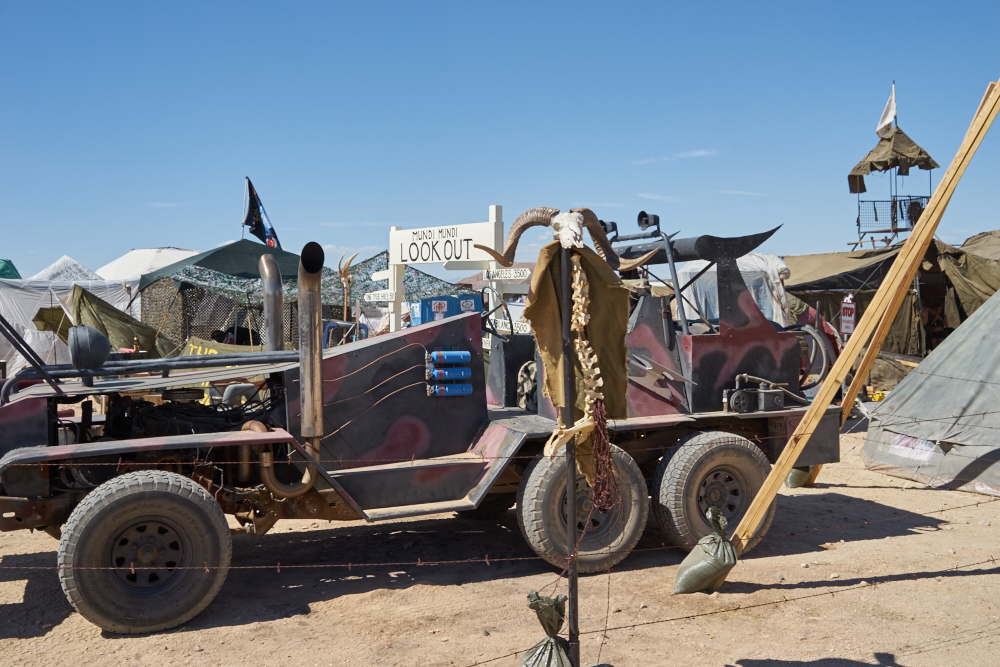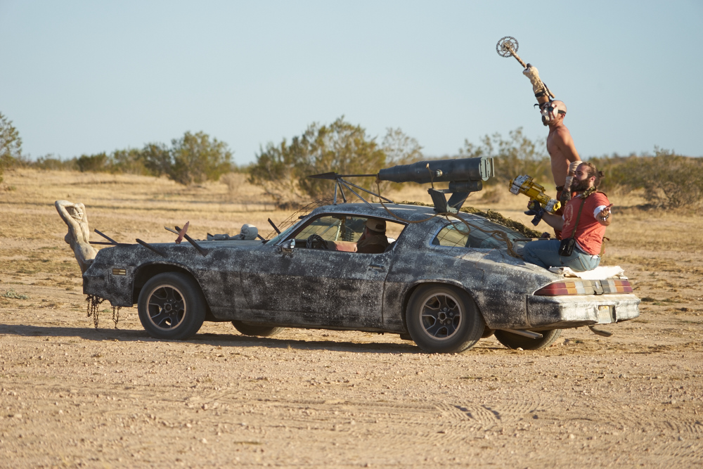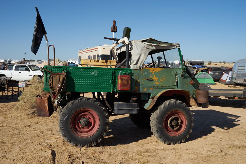 a very odd vehicle with hanging seats and a rear grappling hook.