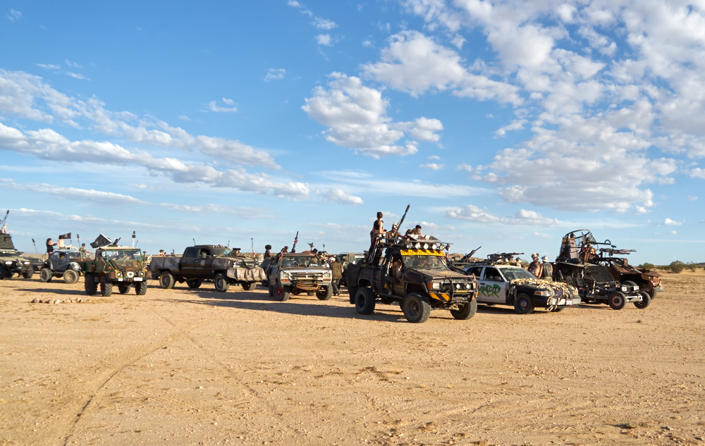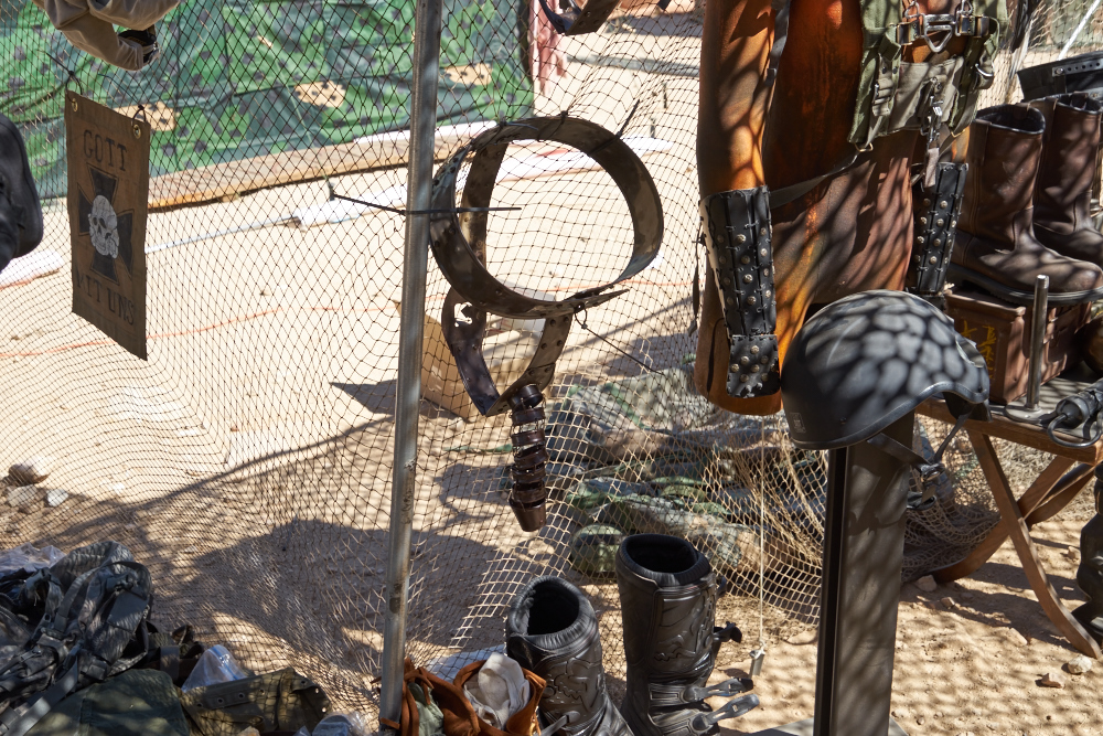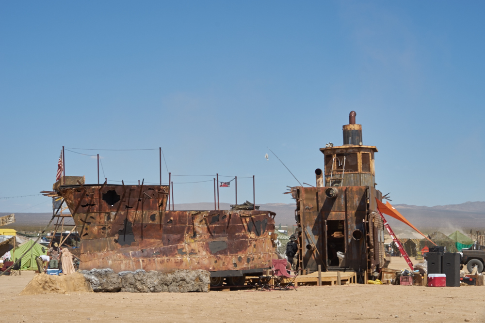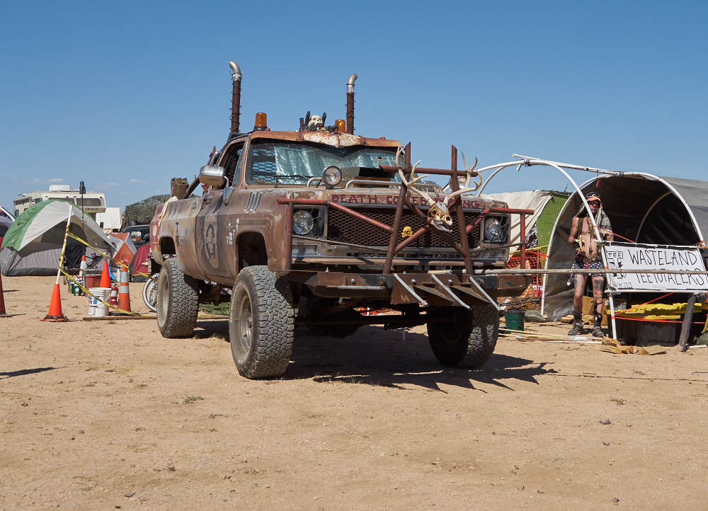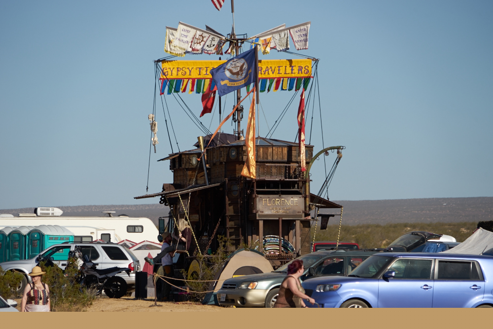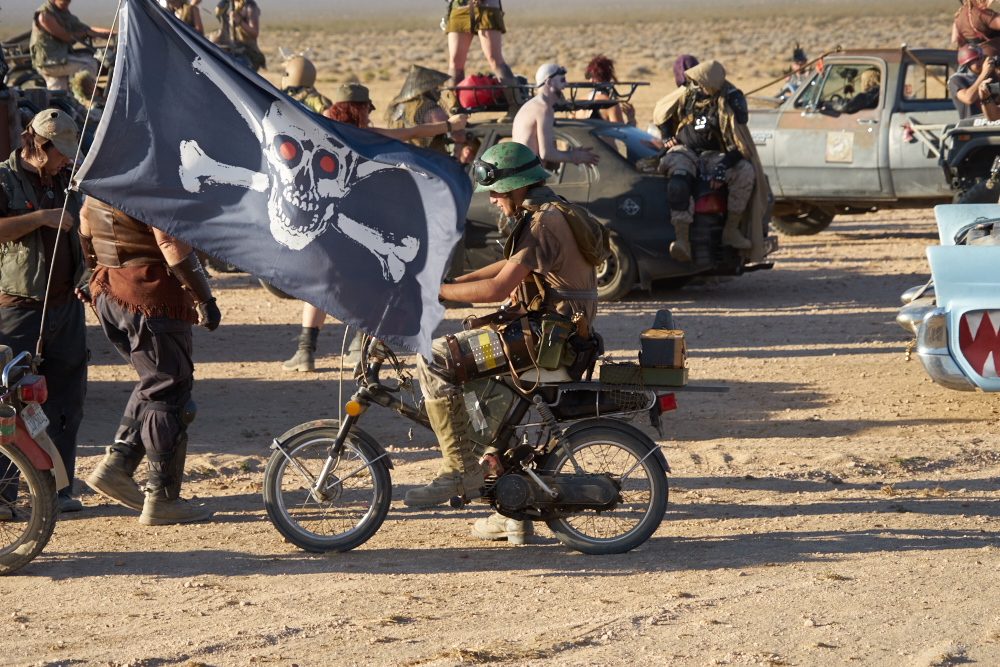 a very odd vehicle with hanging seats and a rear grappling hook.