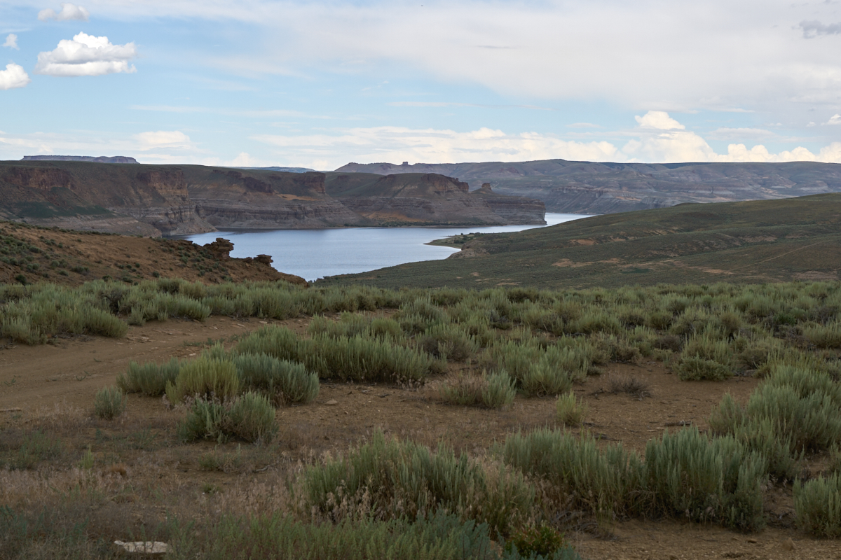 We hit the turnoff and left the pavement and went onto the dirt again. On the top of the highest ridge, we got a view of Flaming Gorge to the north of us.