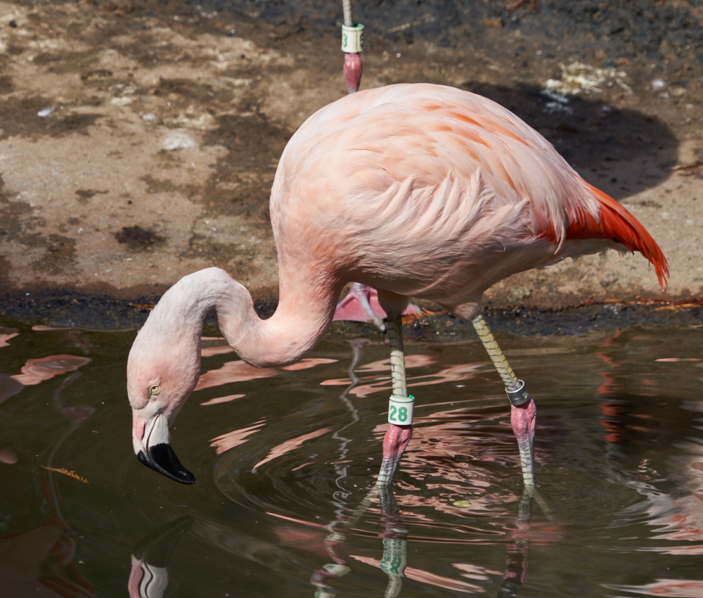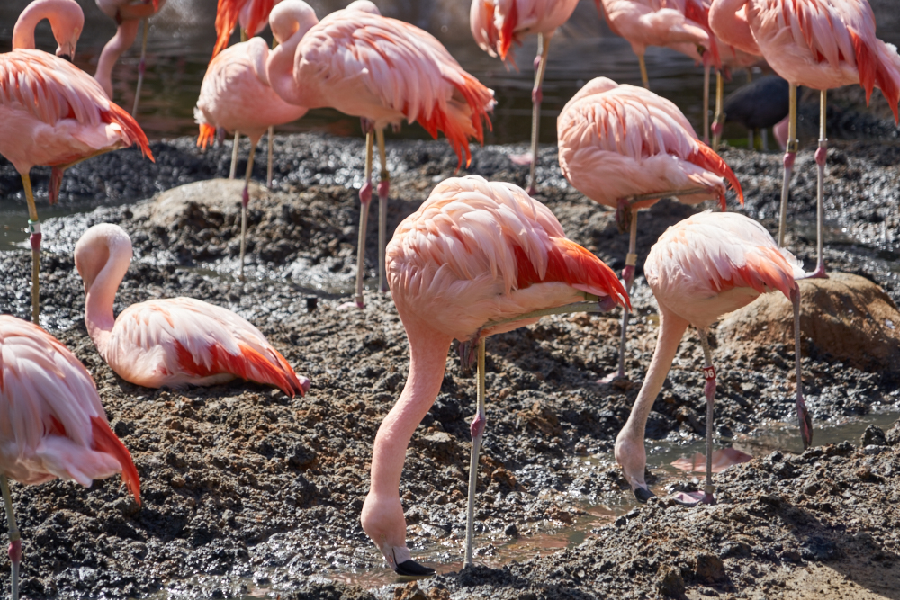 group of Flamingos work the mud of the aviary looking for