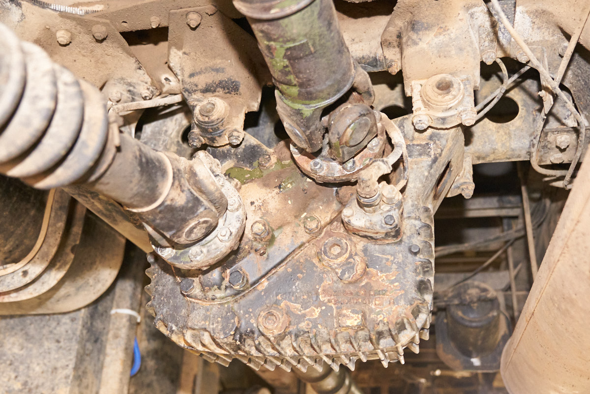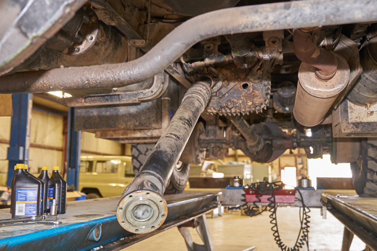 vehicle. Kathleen is inspecting the driveline.