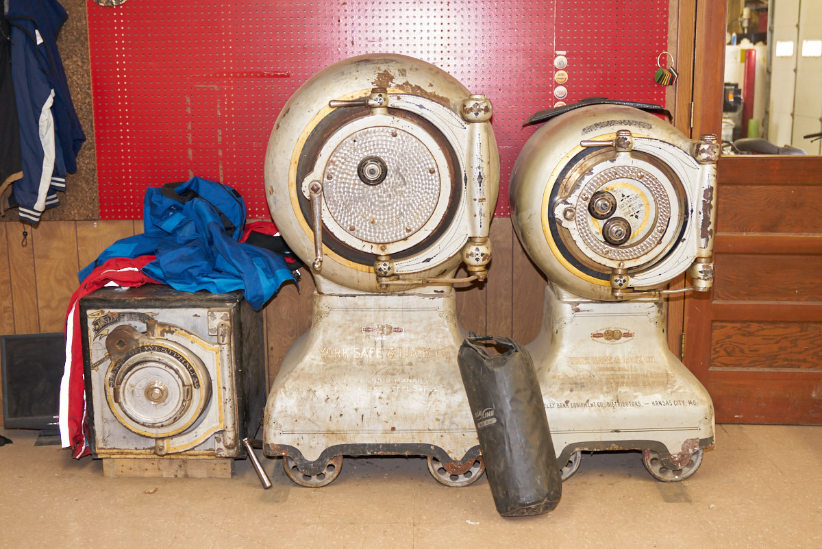 a nice collection of antique safes in his office.