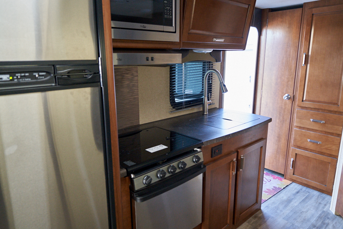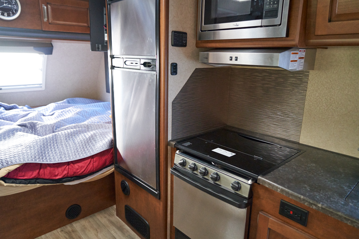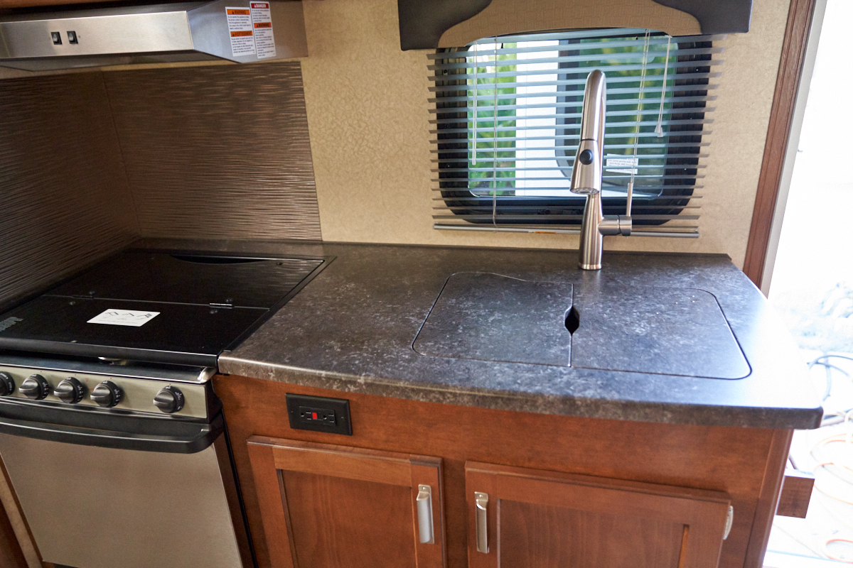 Lance has a nice galley with a 3-burner stove with exhaust hood,