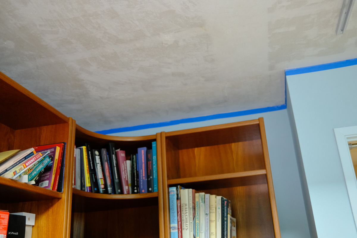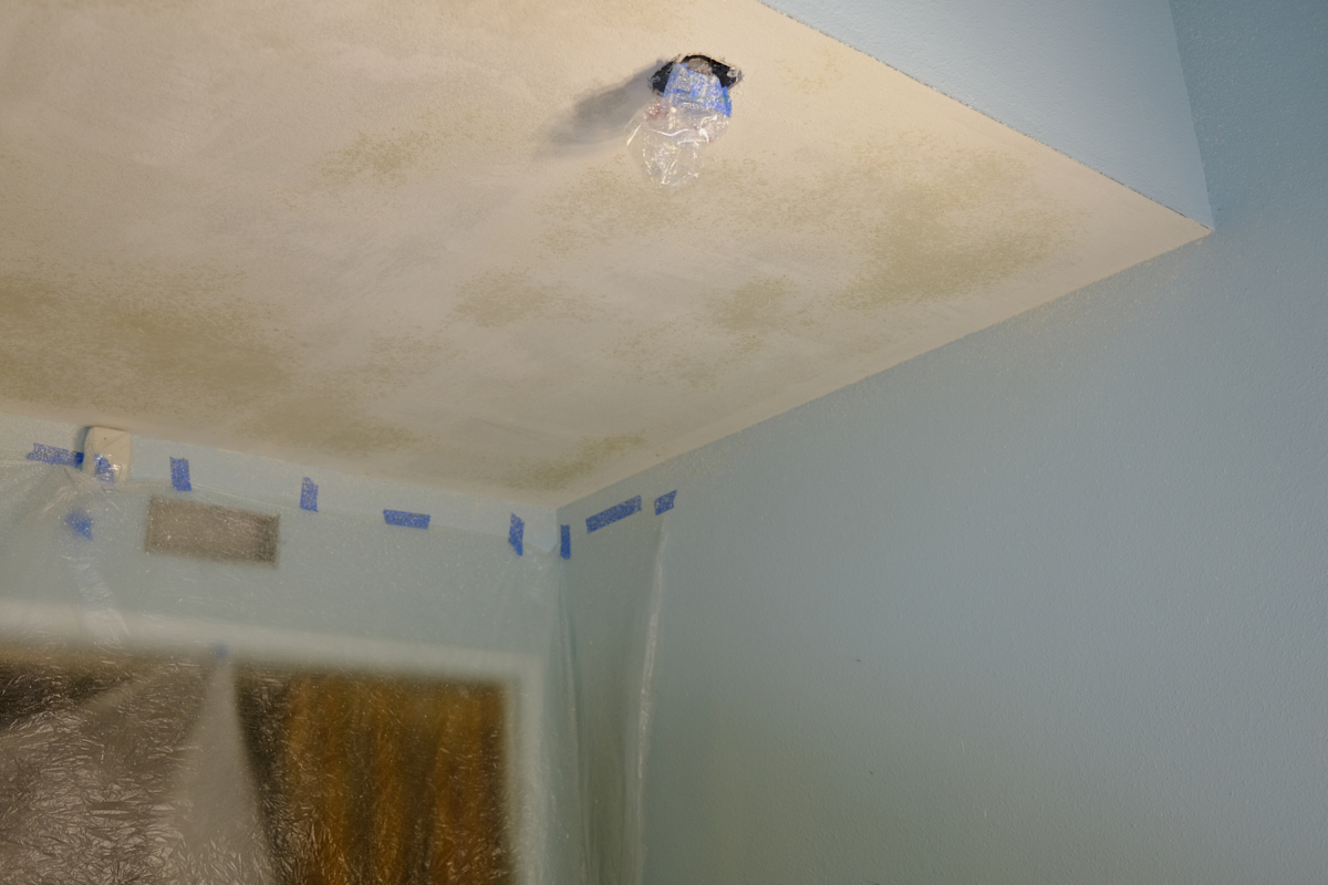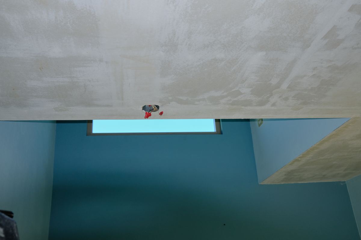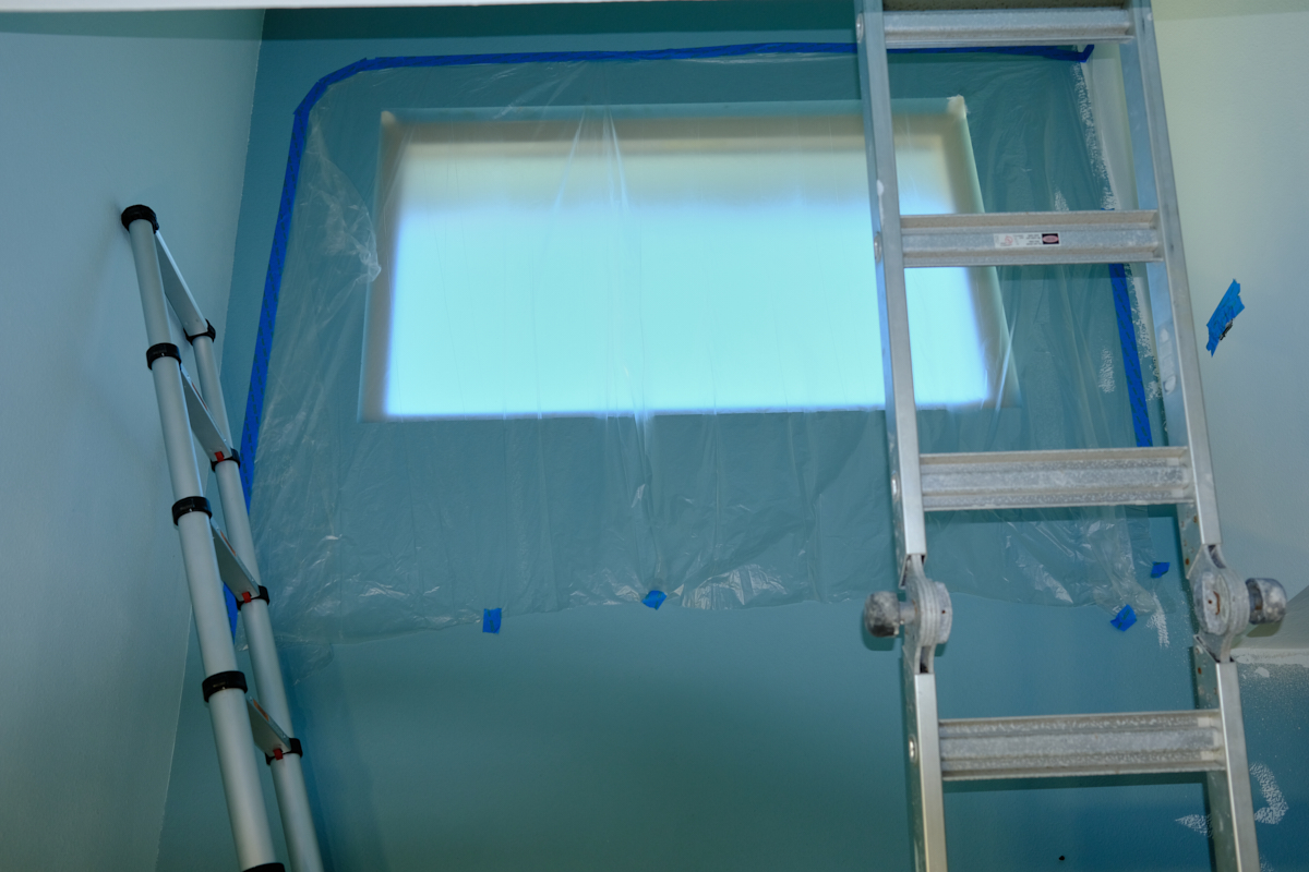 After the new windows were protected with plastic draping, the mud gun was used to apply texture to the ceiling.