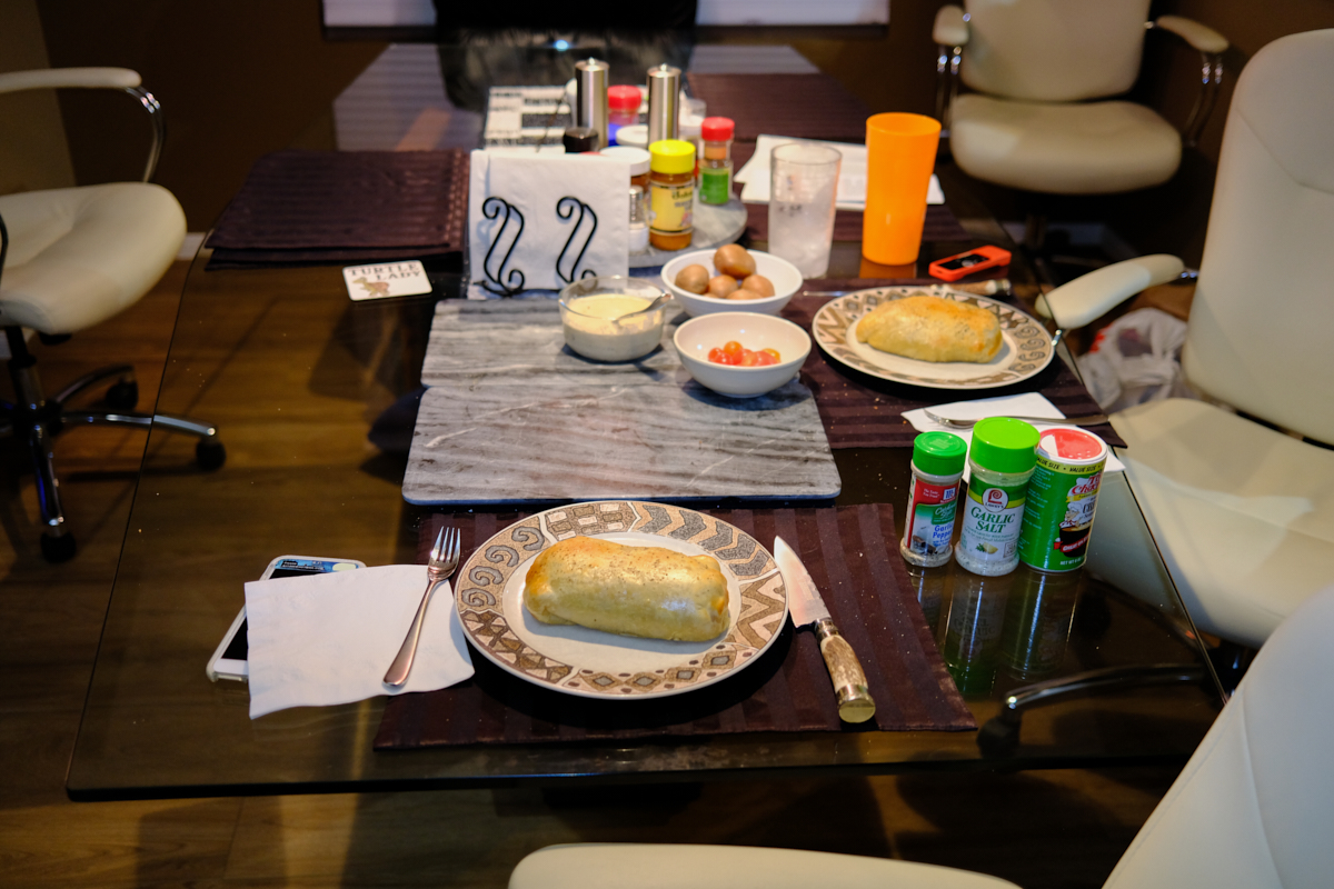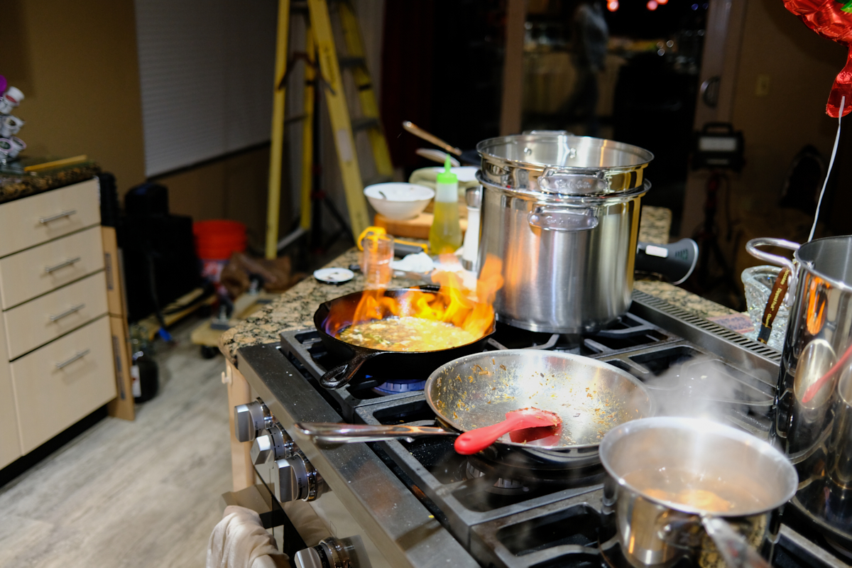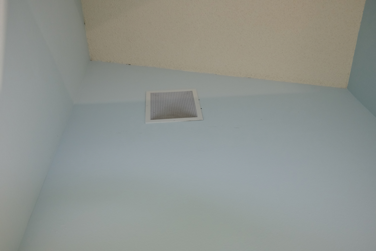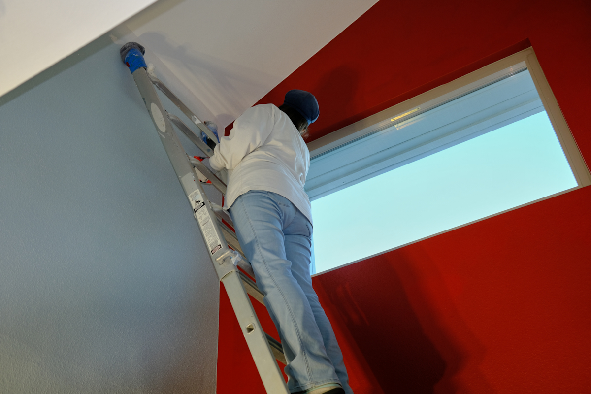 After the new windows were protected with plastic draping, the mud gun was used to apply texture to the ceiling.