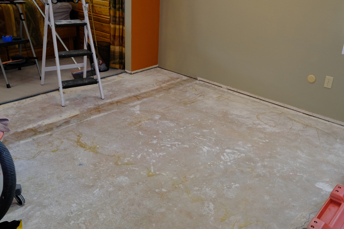 floor was scraped to remove glue, drywall mud and paint