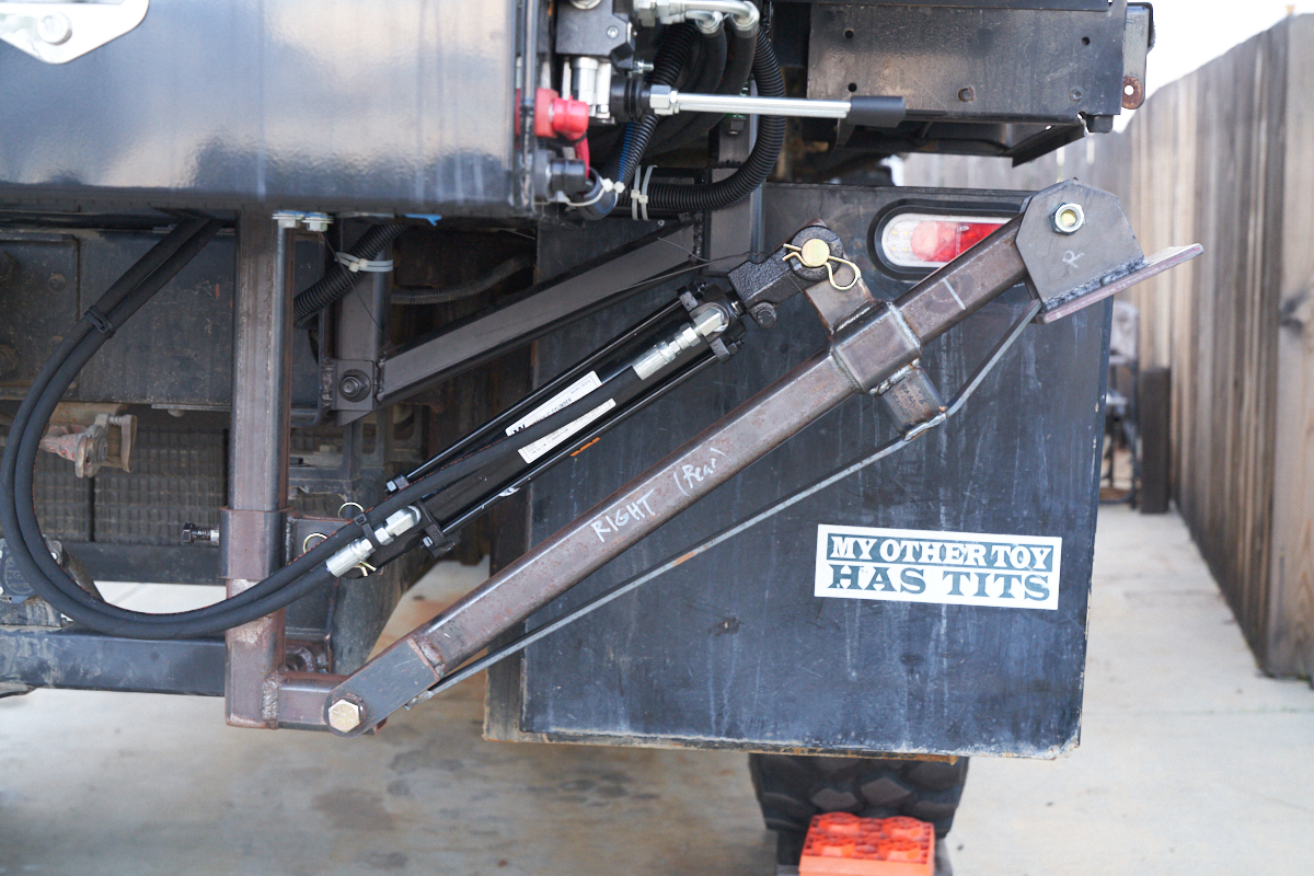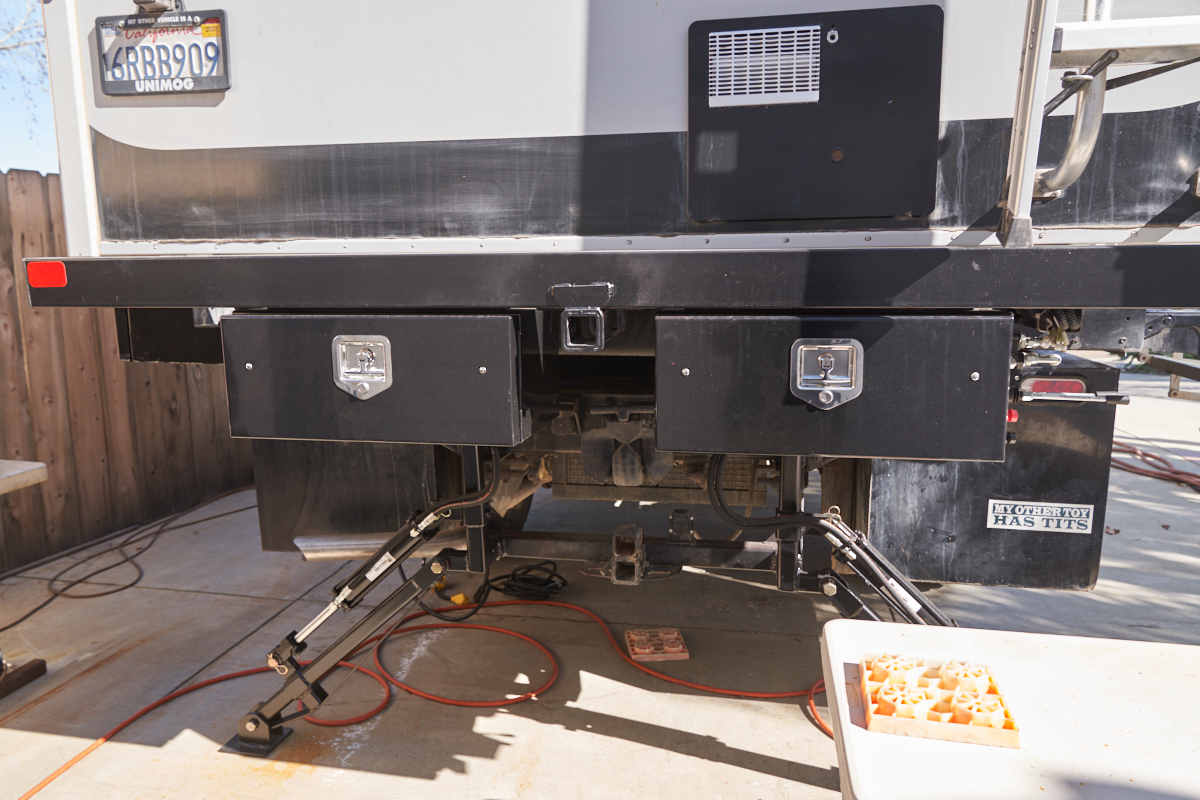 View of both rear tool boxes with stabilizers deployed.