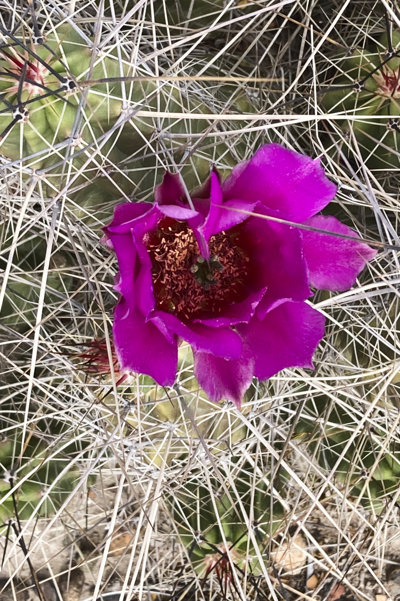 Cushion cactus were also in bloom, albeit with purple