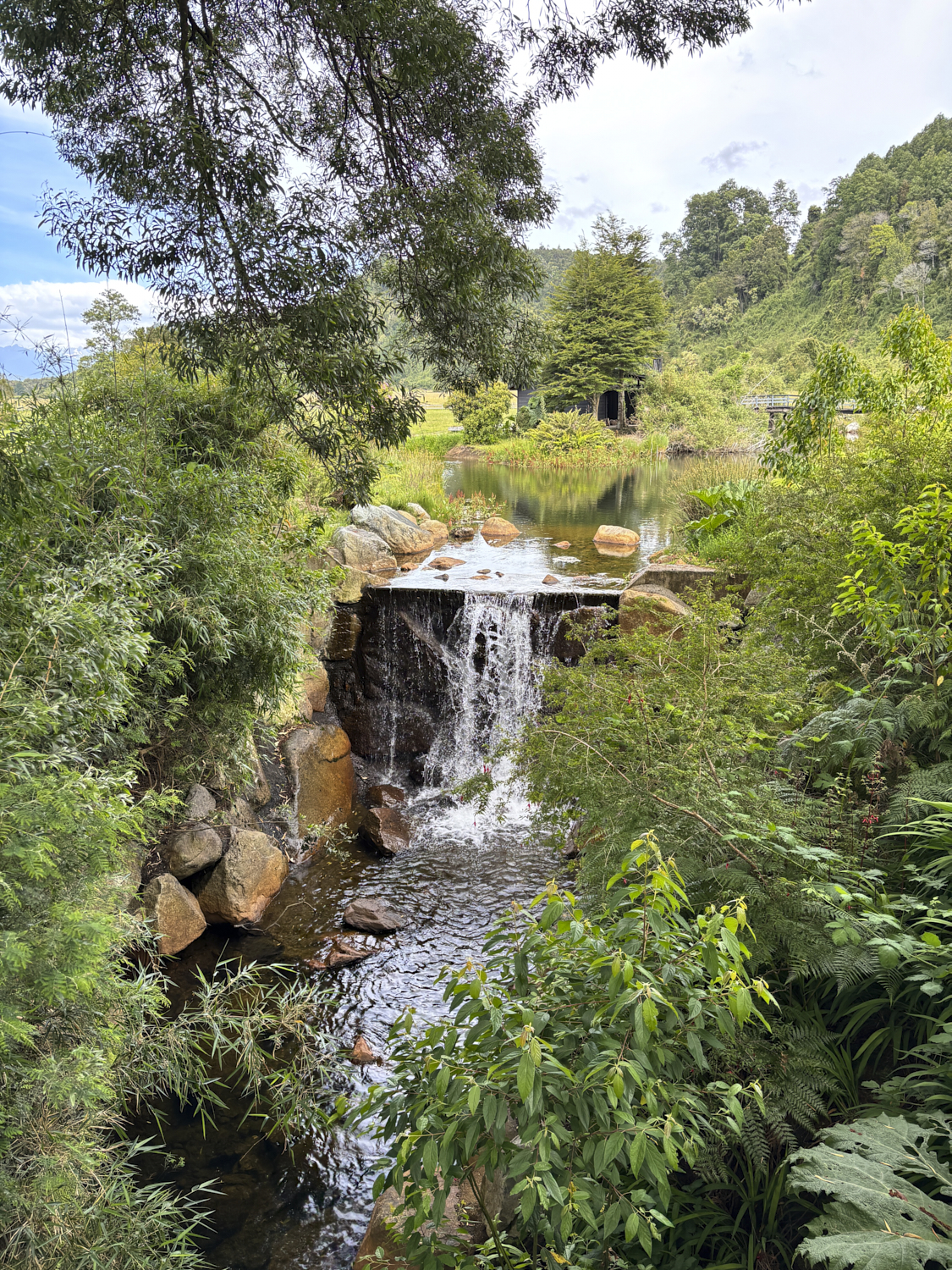 A small (man-made) waterfall on the bridge to the entry of the hotel.