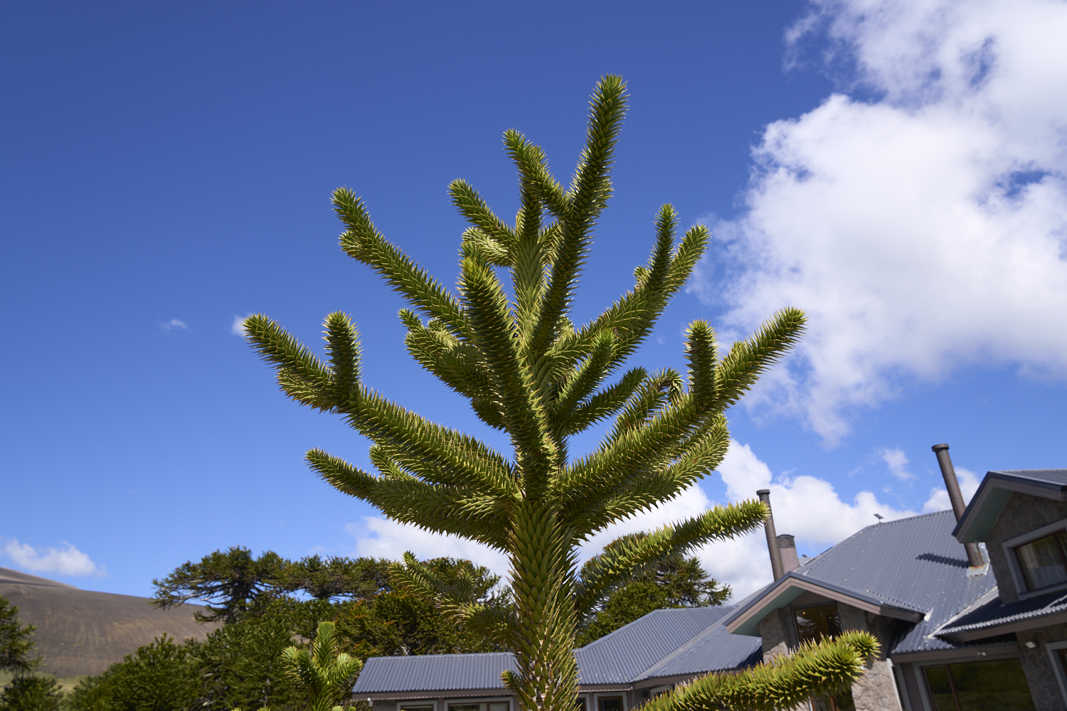 view of a young araucana with the hotel in the background.