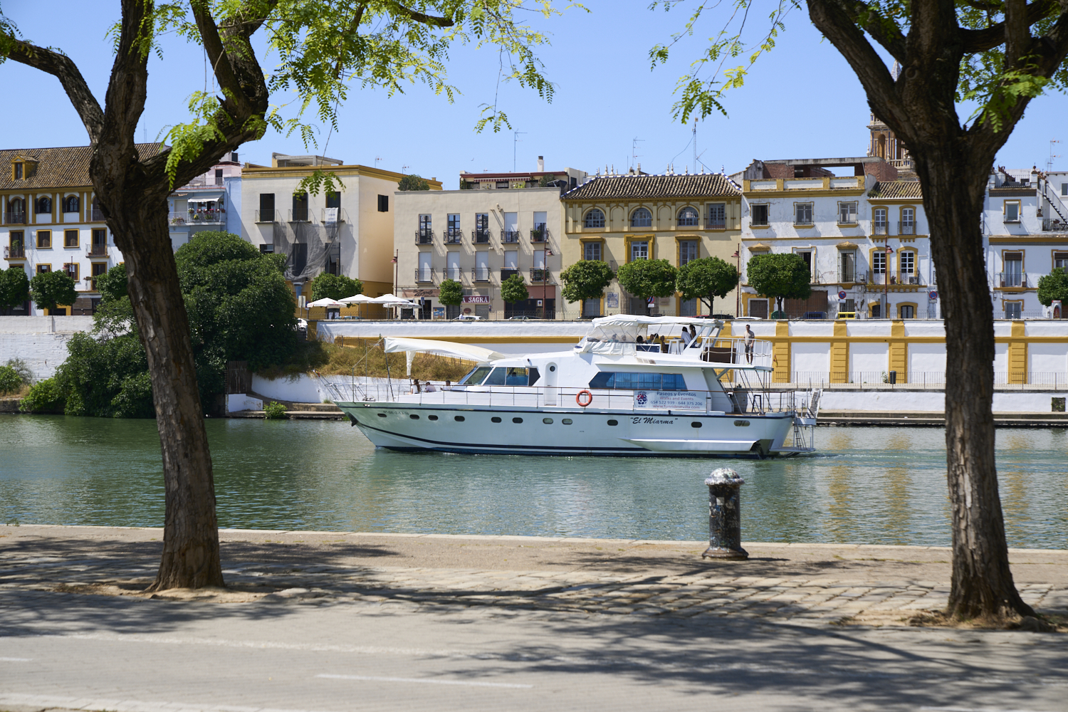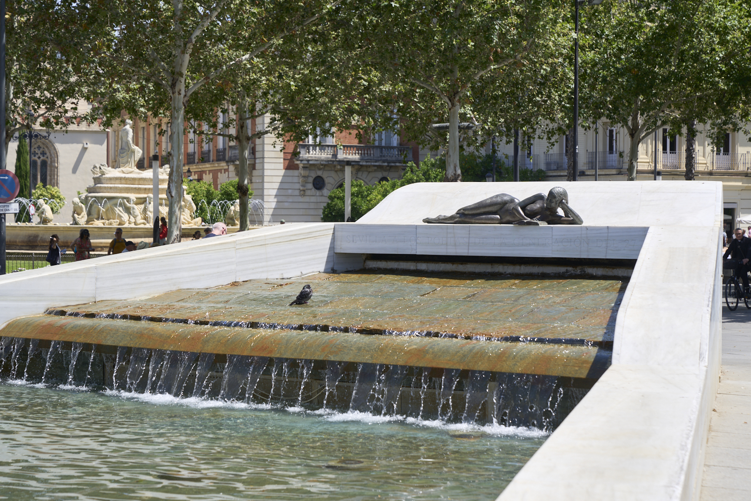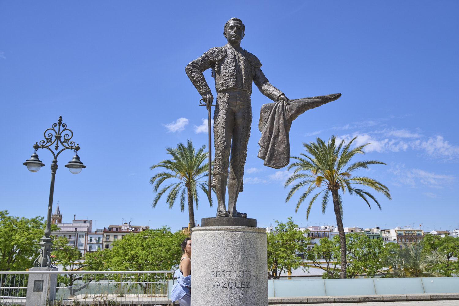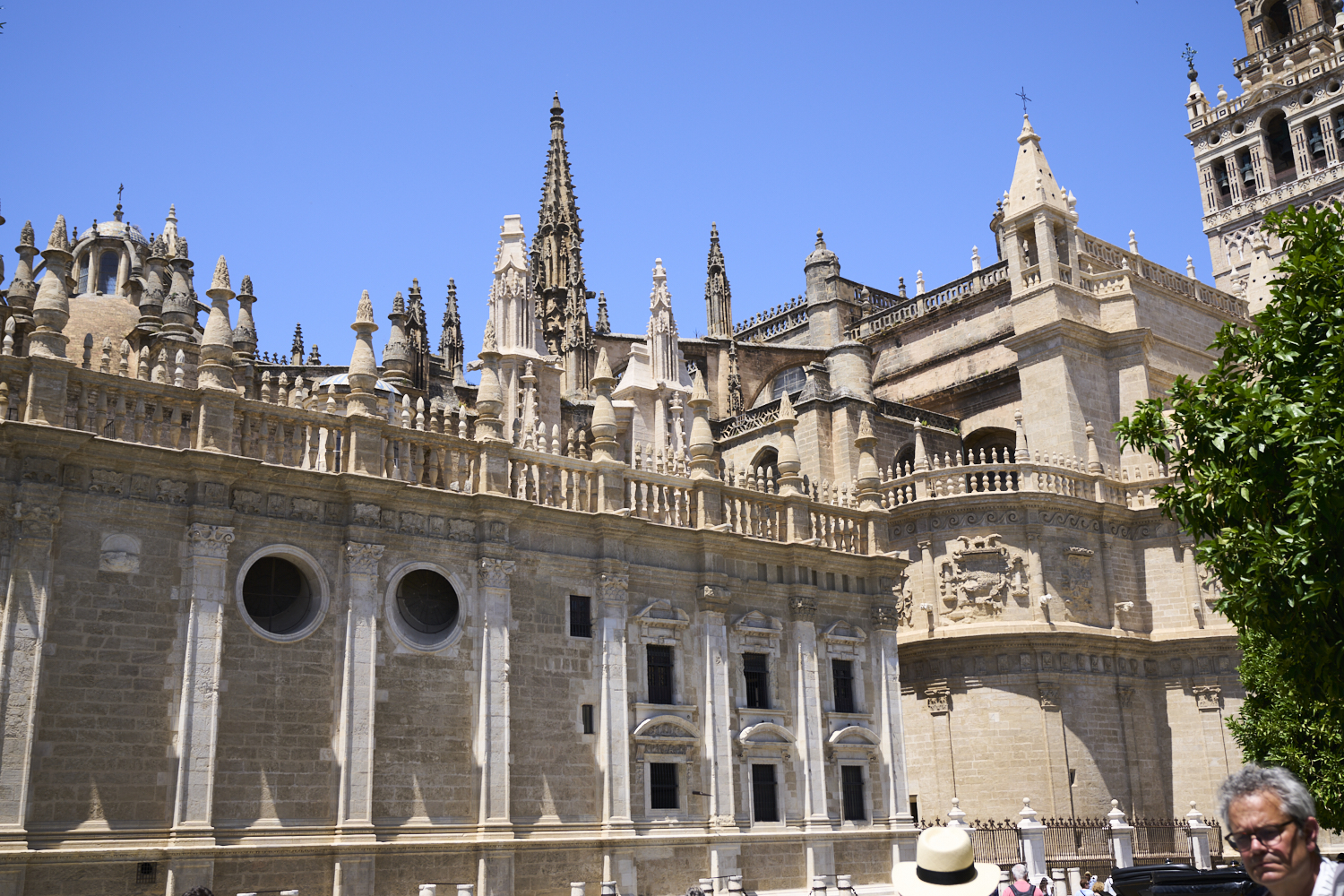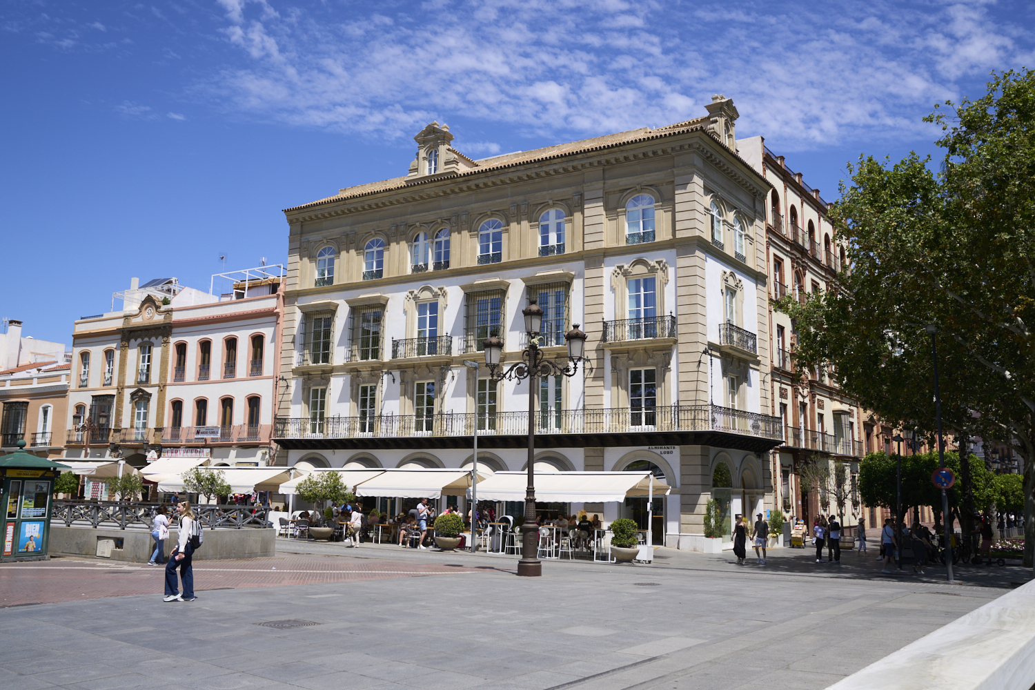 We inverted part of our trip in that we had to taxi from Gibraltar to the border, walk across the border, and then get a taxi to the Algeciras train station. From Algeciras we got the "slow train" to Seville. The trip shot a whole day, but it was reasonably comfortable except for the last, very slow leg. We got into the Santa Justa station and then got a short taxi ride to our hotel near the "center of the action" along the Guadalquivir River at the Triana Bridge. We stayed at the Bequer Hotel, which was very nice. We stayed at this hotel on one of our previous trips to Seville.