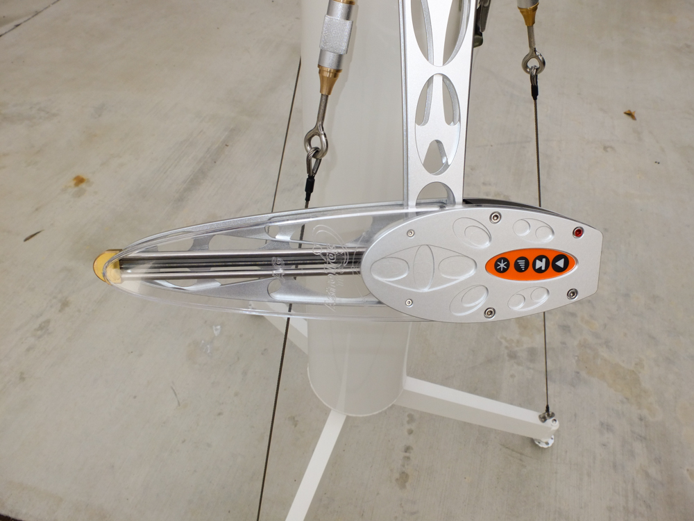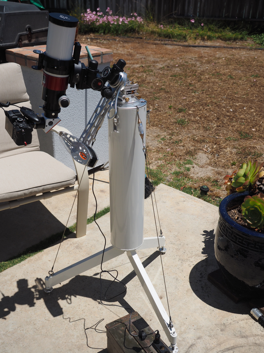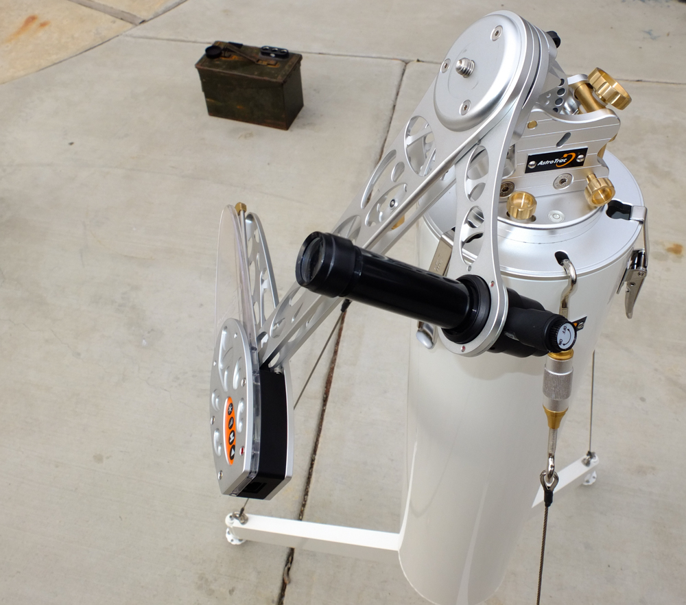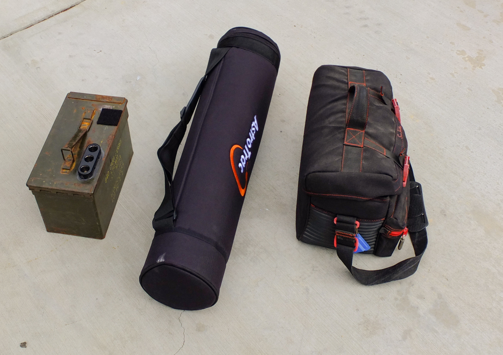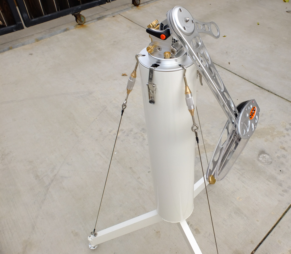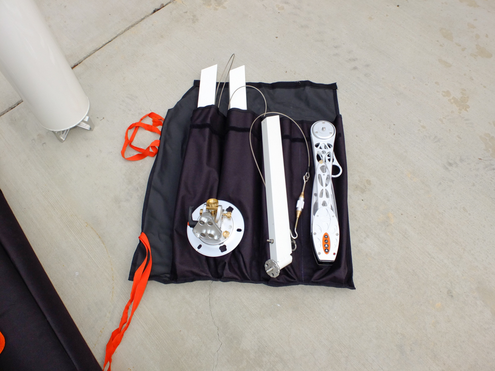 Inside the tube is a roll that contains the tracker head, 3 legs with guy wires, turn buckles and screw feet. The adjustable screw feet are used for for leveling the pier. The mounting wedge is stored upside down at the end of the tube. Note the machined attachments on the bottom for the support legs.