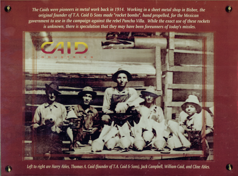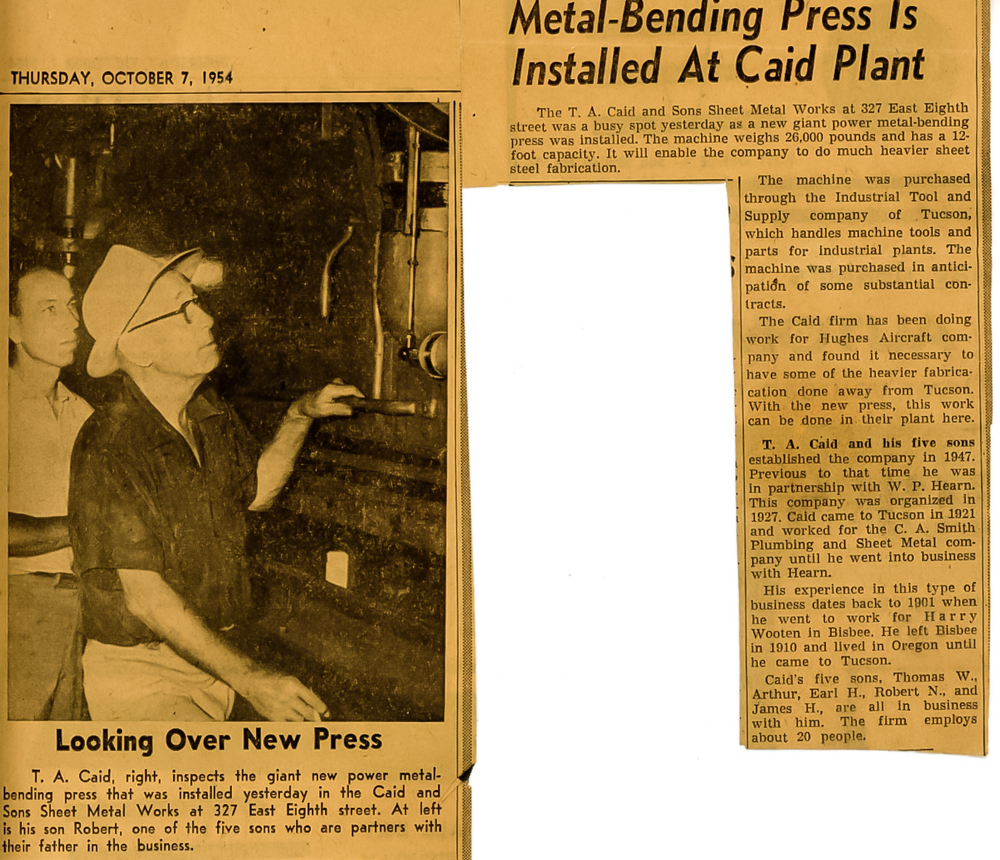 Born of Thomas A. Caid and Teresa Swyers on July 4, 1921 in Lowell, AZ, Bob was the second youngest of the Caid sons which consisted of (in birth order) Thomas, Arthur (Butch), Earl, Bob and Jim. Bob's father, Thomas A. Caid, a pioneer in Southern Arizona sheet metal, started a business in Bisbee, AZ in 1917. Later in Tucson, in conjunction with a partner, "Hearn and Caid Sheet Metal" was formed in 1927. In 1947 T.A. Caid and Sons was founded.