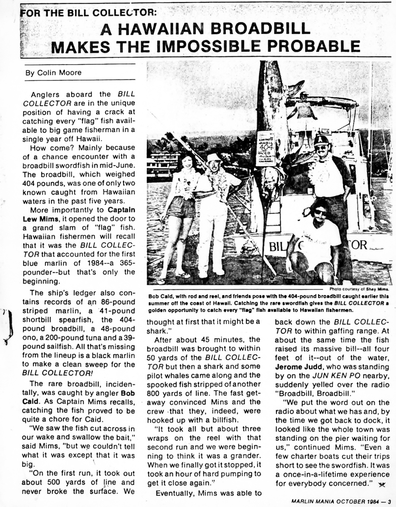 On a trip to Hawaii in 1984, Bob caught this whopper broadbill marlin. It was a near-record and was reported in the local sports news.