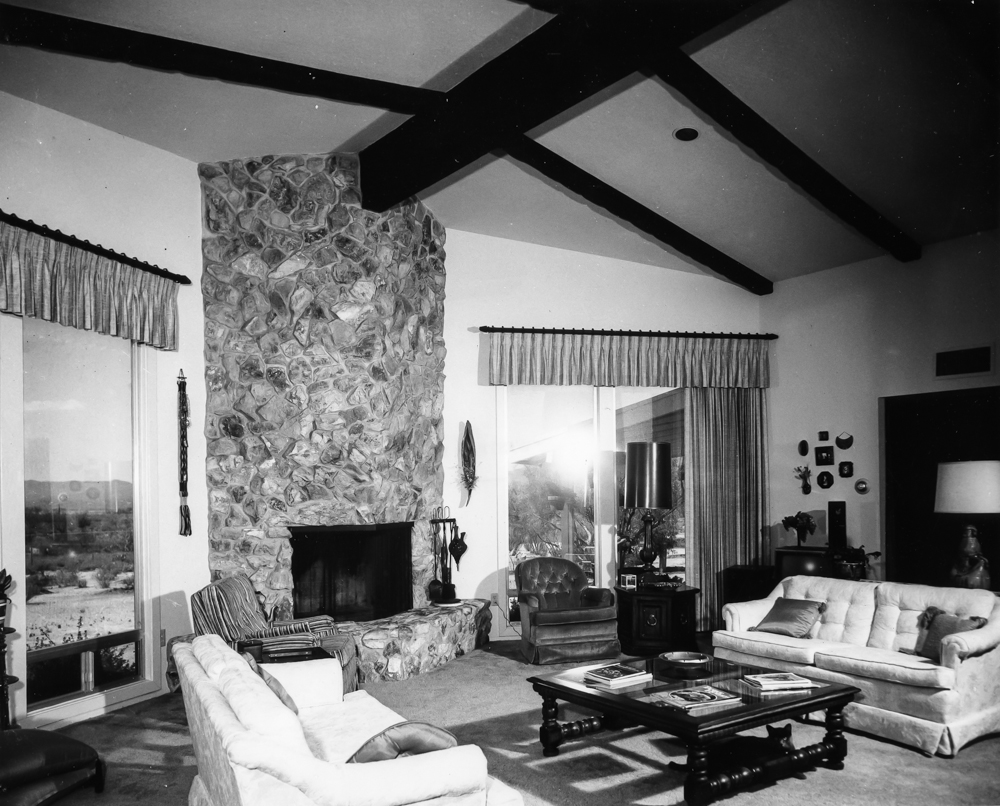 The signature of the house was a high, sloping roof line that ended in a massive fireplace made of copper ore. While the motif of the furniture clearly dates the interior decorating, it was an excellent execution of a great idea.