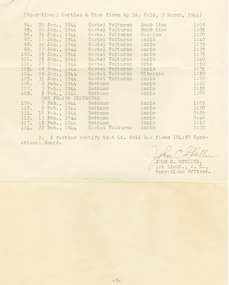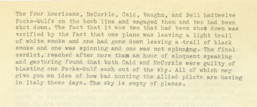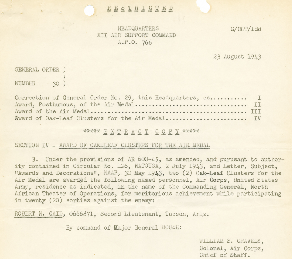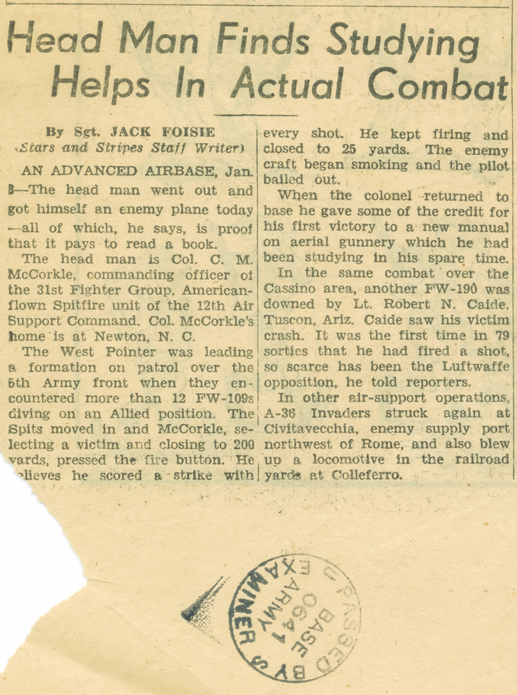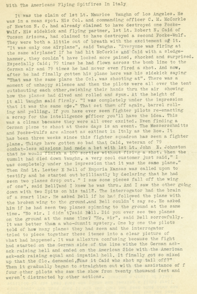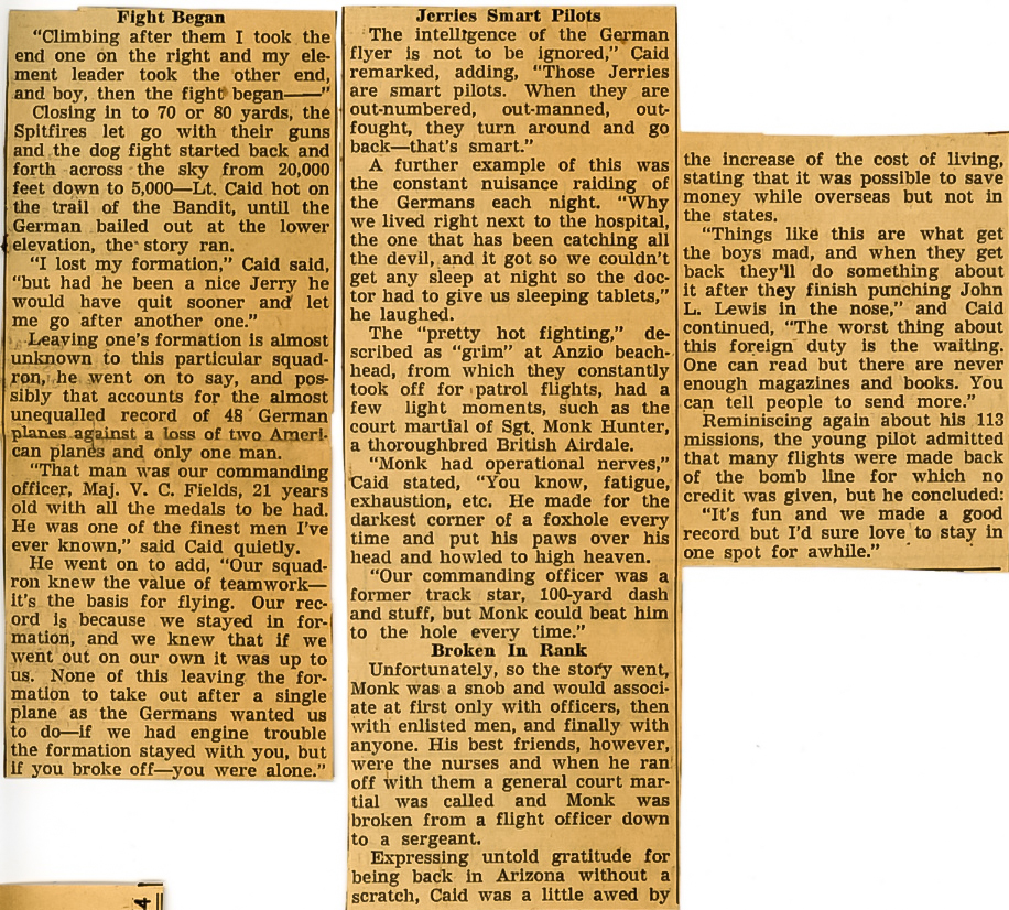 A clipping from the Stars and Stripes newspaper that describes the action. Note that the clipping was reviewed and passed by the Army censors and is complete with misspelling of the last name ("Caide" as opposed to "Caid").