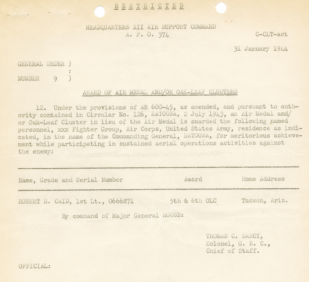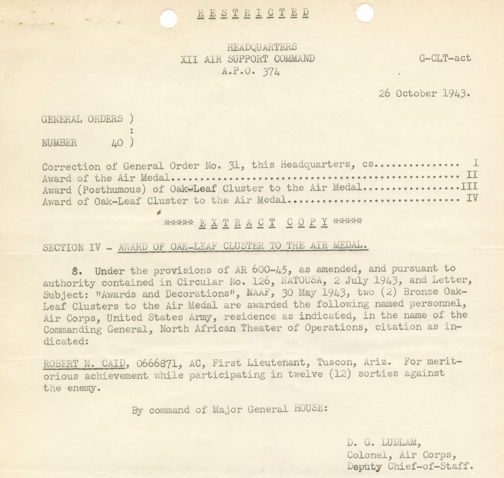 In addition to the DFC, Bob received a series of awards for service in combat. These awards, called the "Air Medal" result from meritorious actions during combat. When additional instances of valor are recognized and the recipient already has the medal, it is referred to as an Oak Leaf Cluster that is appended to the medal.