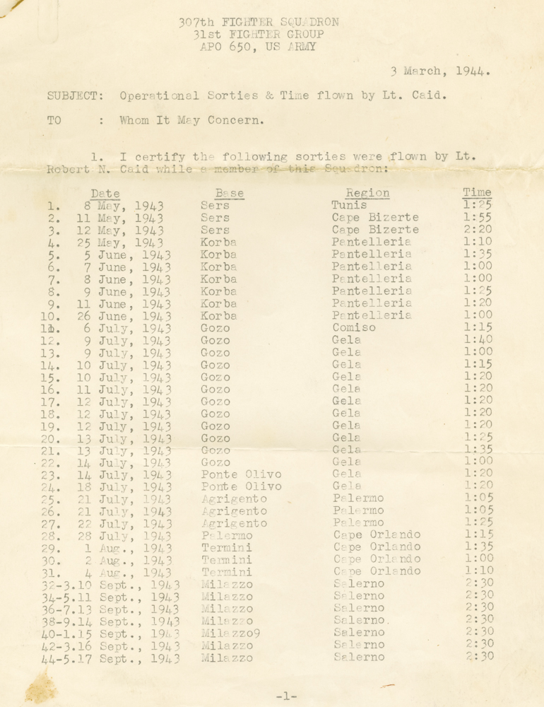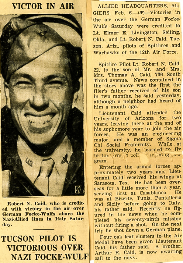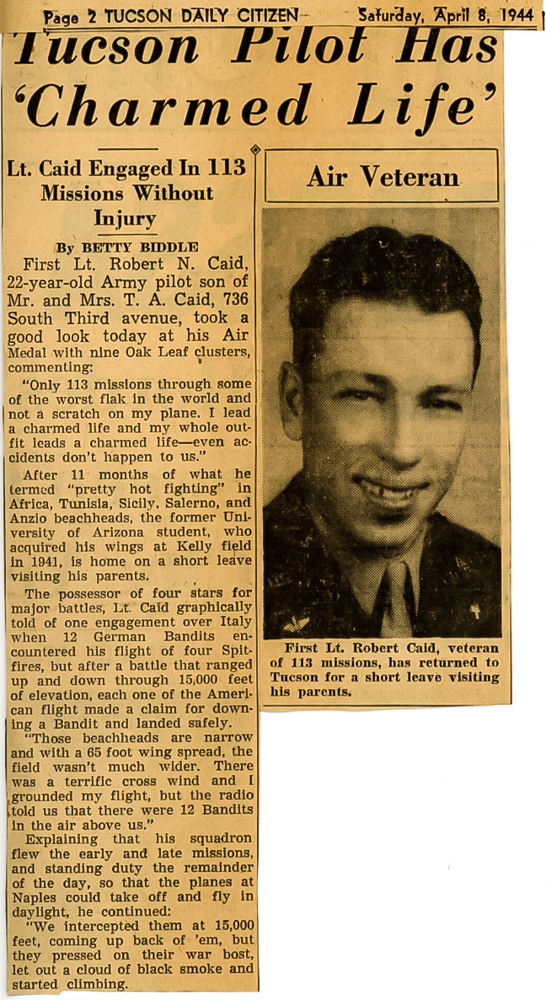 Bob graduated from Tucson High School and learned to fly in the civilian aviation program during early college. After receiving his pilot's license, he enlisted in the U.S. Army Air Corps (USAAC) in January of 1941 as a pilot cadet. Upon completion of his training program he earned his commission as a second Lieutenant and was deployed to the European Theater. During his war-time missions Bob flew both Mark 5 and Mark 8 Spitfire fighters with USAAC. Bob saw combat action in North Africa, Malta (as part of the invasion of Sicily), Sicily and Italy flying a total of 114 missions against the Axis powers. He participated in the Salerno, Anzio and Cassino campaigns frequently flying from beachhead positions.