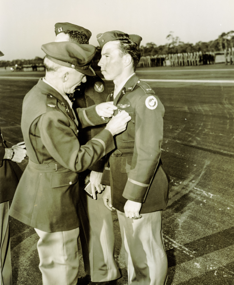 commander pins the Distinguished Flying Cross (DFC) medal on
