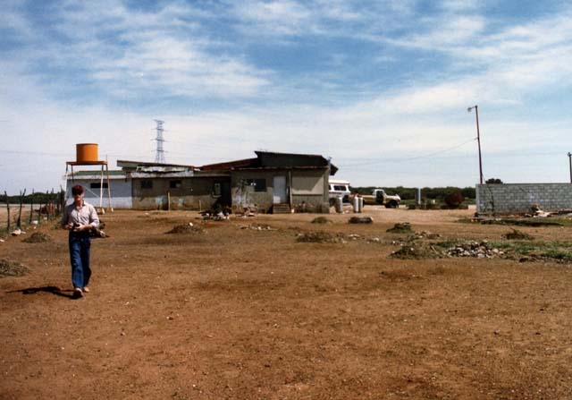 Getting from San Diego to El Condor was pretty much of a no-brainer. The border crossing was easy and the trip on Mex highway 2 was uneventful. We got to El Condor at about 10am and got ready for the trail. El Condor can be seen in the photo below. Basically, it is a bus stop, road house and home all in one. Below, you can see the tail end of a Mexican bus parked at El Condor getting passengers. Note the yard is naked dirt and there is no vegetation of any kind. The water is stored in the elevated tank on the left, probably filled by a truck that brings it from another rancho with a well as there was no well here. Below, my passenger Steve Anderson returns from taking photo of the building. As backwater buildings in Mexico go, El Condor was better than most. After all, it *did* have a steet light.