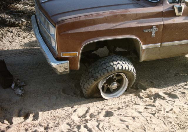 Sometimes, the "ignorance is bliss" philisophy works, but not this time. It did not take long before we got into trouble. Bruce hit something with the truck, the result is below. As you can see, in addition to taking the tire off the rim, it bent the rim as well rendering the rim useless.