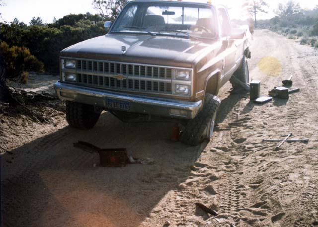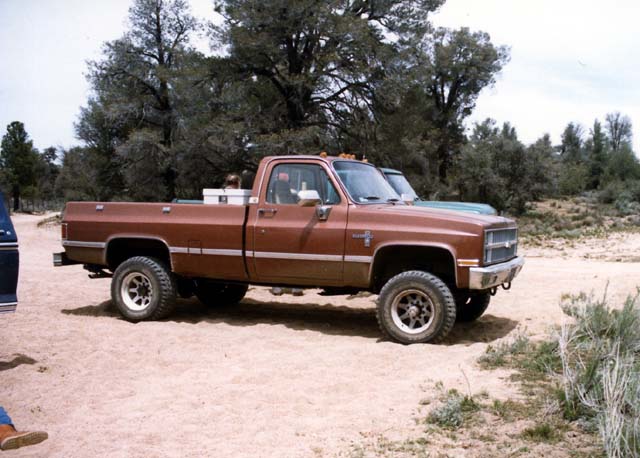 Below is my nearly-new 1982 K-30 diesel 4X4 truck with all the amenities. I bought it new and it was not a very good truck. While that is another ugly story, I can say that the experience has caused me to boycott all GM products to this date. Note that the trees are getting bigger and that the sand in the washes and trails is unconsolidated, resulting in very soft conditions and the chance of getting stuck.