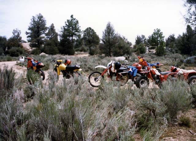Below is a rest stop for the group. Note that the character of the terrain has changed due to the increase in elevation. Now there are pine trees in addition to the scrub brush. Also, the rolling terrain has given way to granite boulders and their by-product decomposed granite sand.