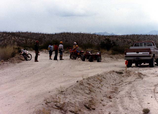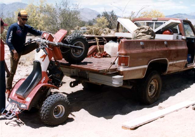 After we completed story hours, we headed north to the head of San Matias wash and the highway portion of the trip. Below, we are at the head of San Matias wash, preparing to load the 3 wheelers for the highway portion of the trip. Note the wheel on the back rear is one of Mike's.