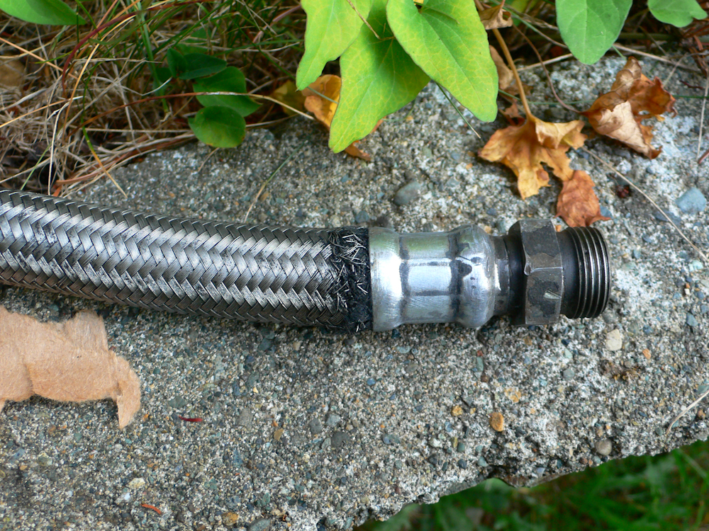 It took 12 years, but it did finally fail. Vibration wore out the interface between the connection and the steel braid allowing a leak that vented the output of the compressor.