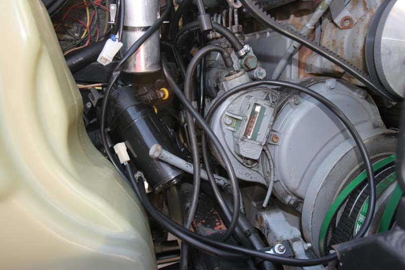 A/C compressor and new water pump pulley installed. Kai had to re-fabricate the bracket for the fuel filters. The dual black belts on the engine pulley are for the hydraulic pump for the winch.