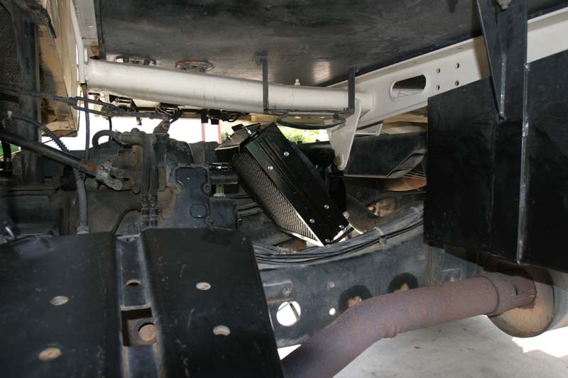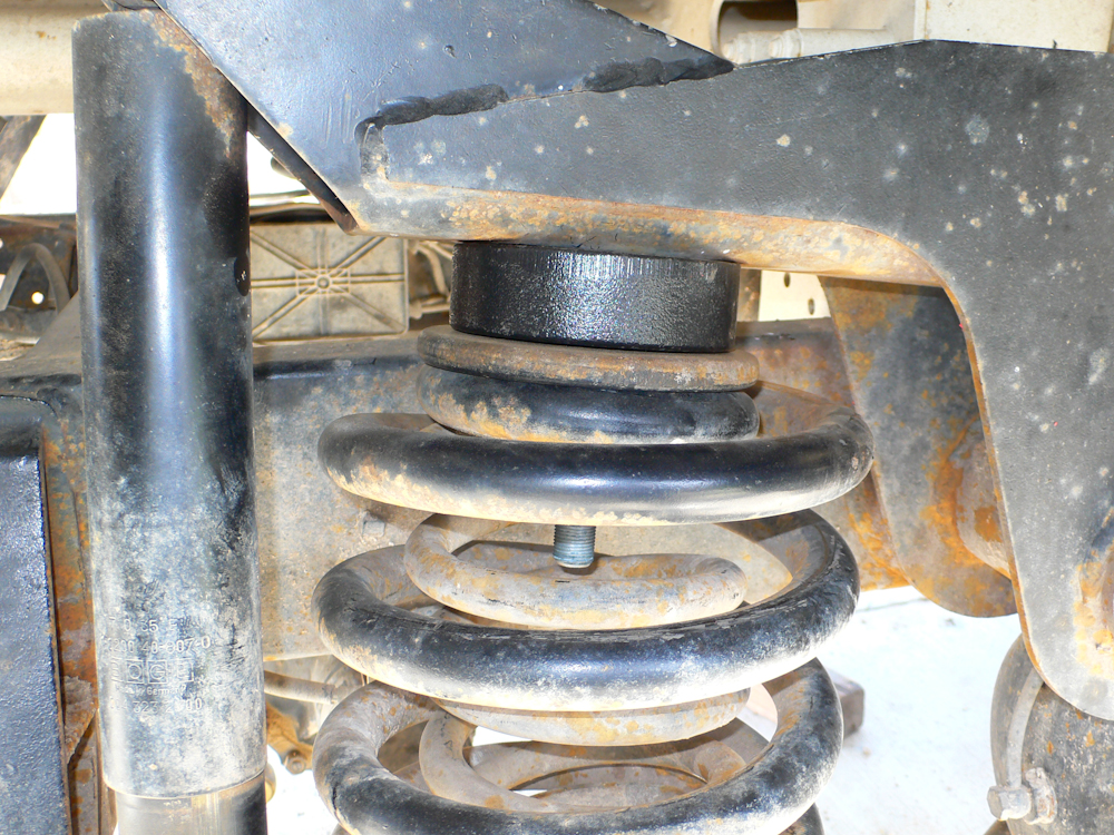 In principle, the task seemed easy enough: raise the frame of the truck (not THAT easy when the rig is 14,000 pounds), and undo the coil spring retaining bolts. Then, the puck and puck plates are installed along with longer bolts. Then, the shock extension brackets are installed. Sadly, this was not sufficient to prevent the tires from rubbing on the fender. My email exchanges with Pete told me that I also had to move the front fender and top step to fully complete the job.