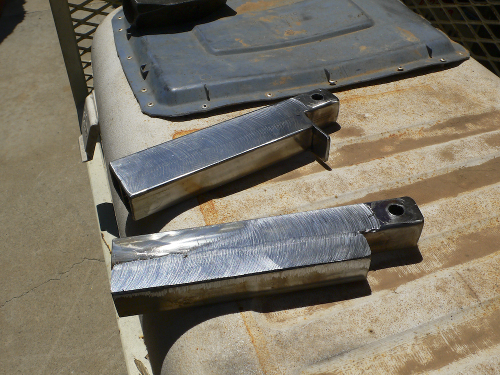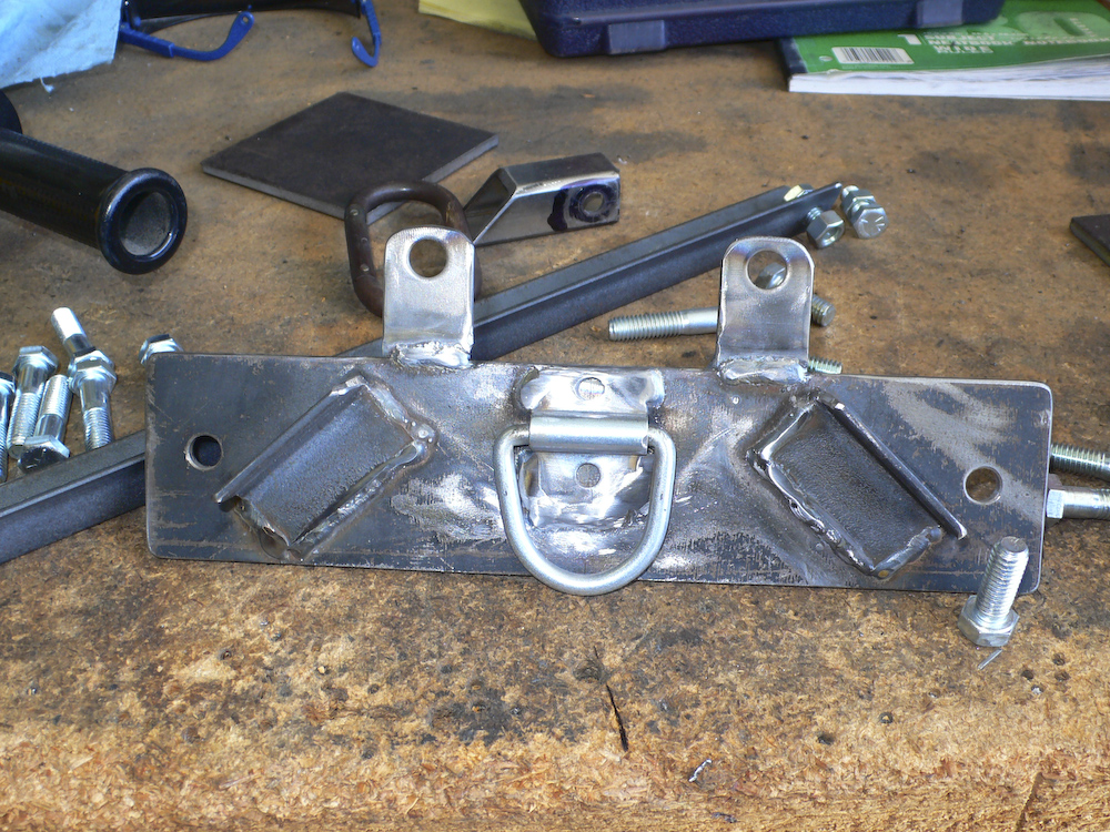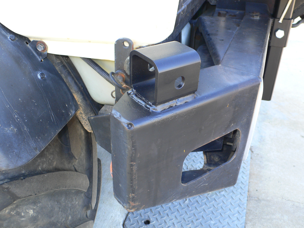 To address the need for a holding fixture for repairs, I decided to use a spare vice that I had in my garage. I went to the steel store and bought some trailer hitch components and some 3/8" steel plate. Mark was kind enough to lend me his cutting torch and drill some holes in the plate and tubing. The outer sleeve was then welded to the front of the bumper with careful attention to allowing the bumper fascia to be removed if required. In the current location, the vice is usable as-is, but another mount is needed to allow use for normal operations.