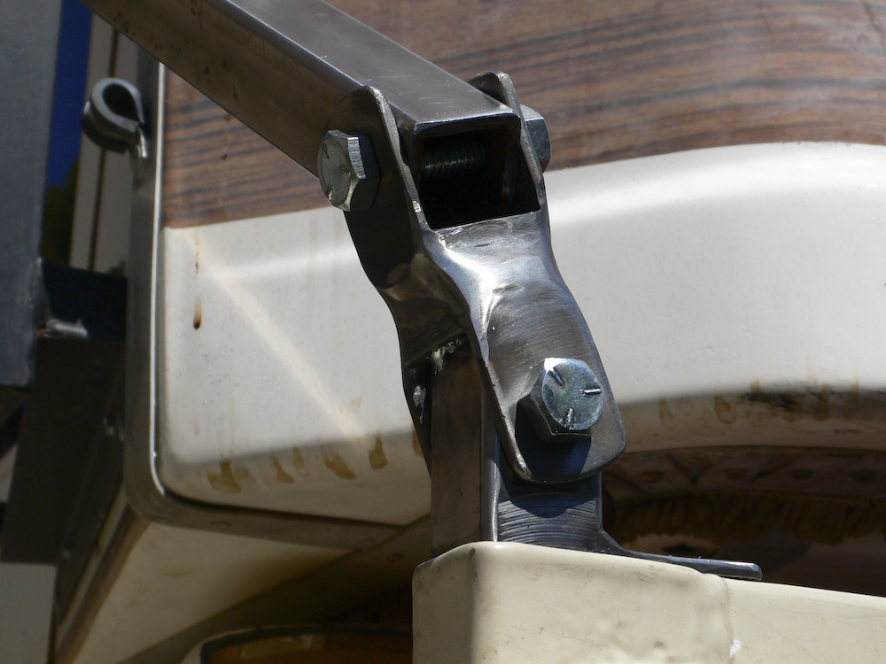 The mounting saddles will fit on the bed sides. Above, the holes in the mast have not yet been drilled and it is being fitted. The saddles will be connected to the bed with 3/16" pop rivets. Ball-lock pins will hold the mast in place.
