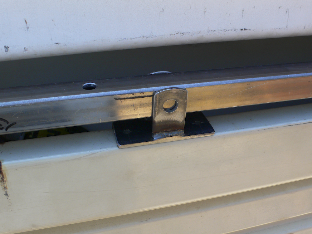 The masts were about 1.54 meters of 3mm x 25mm square tubing. Above, you can see that the insert has been pounded into the bed side.