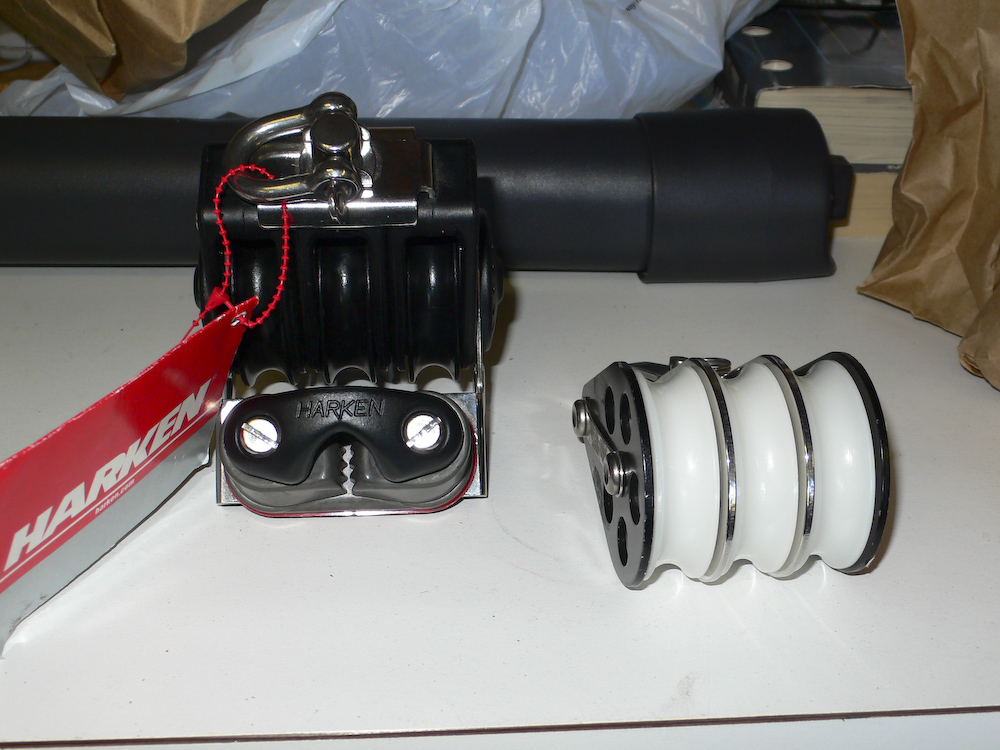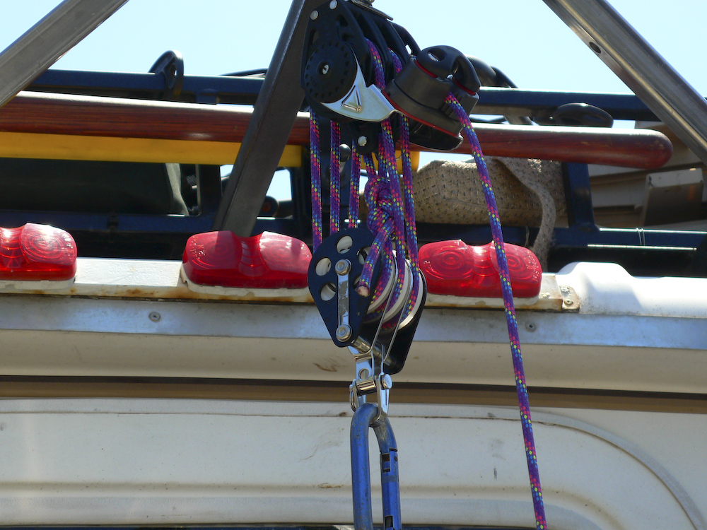 A close-up of the block assembly. Note the rope in the cam cleat. Also, you can see the tension member just to the left of center in the photo. It is connected to the roof rack mounting frame. Once this test was complete, the parts were disassembled so they could be primed and painted. Once the paint is dry, the saddles will be affixed and the whole crane will be reassembled "for real".