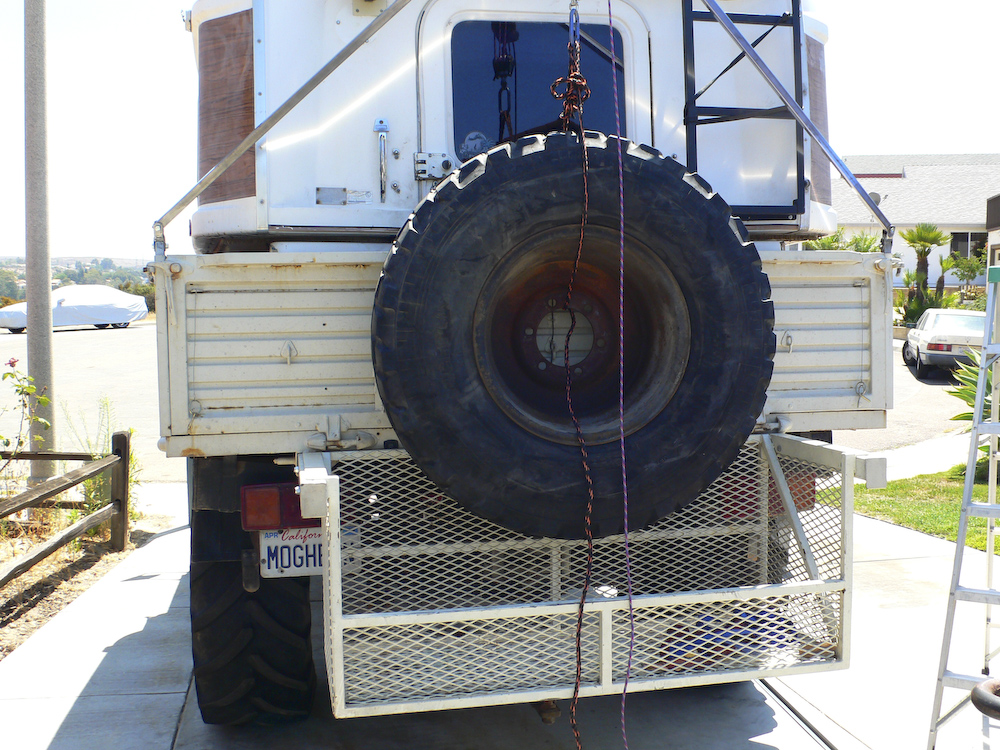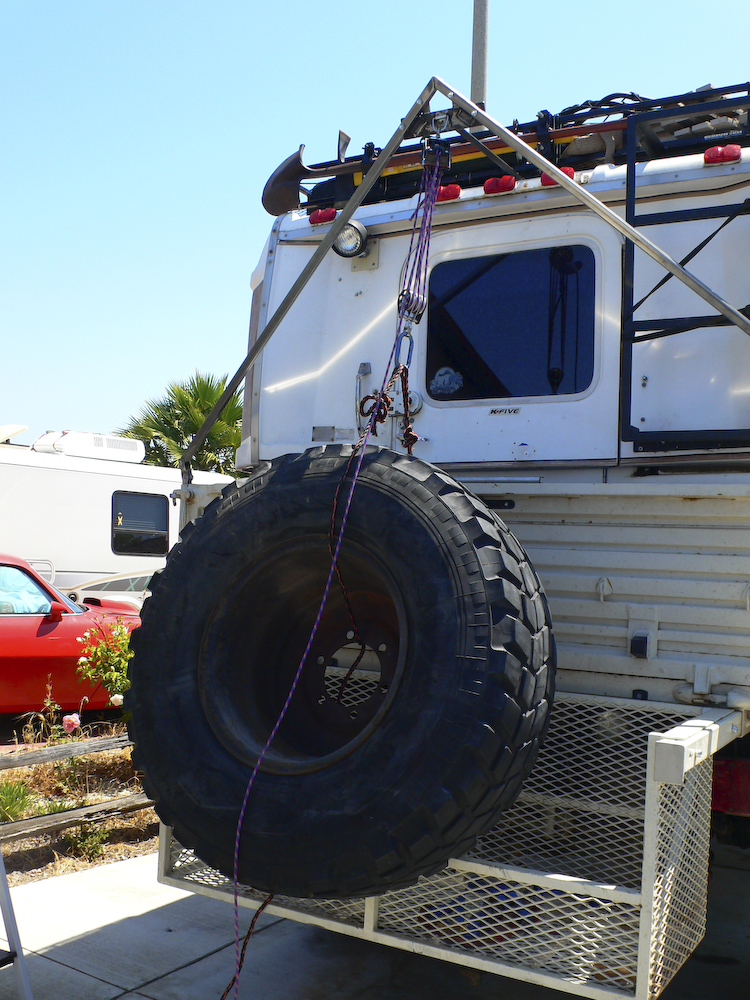 The problem with big tires is that they are heavy. And really big tires are really heavy. The basic tire for my 1300L is the 14.5R20 which is a big tire. But, to allow deep sand operation, even bigger tires are needed. For the past 5 years I have been running Michelin XM-47s. These work great off road, but the problem is that once the camper was installed, there is no place to stow a dead tire in the event of a flat. I use the stock spare tire mount in my truck and it easily stores the 14.5R20s. But, the XMs are way too wide to be stored in that rack. So, if a flat occurs, using the 14.5s for a spare is fine, but without a place to stow the dead tire, I would have to abandon it. And, unless I was willing to de-mount the tire, I would have to abandon the rim as well.This would be both costly and wasteful. Before the camper was installed, the dead tire would just be hoisted into the bed using the canopy hoops and a come-along. But, after the camper was mounted, there is no place to store the dead tire.