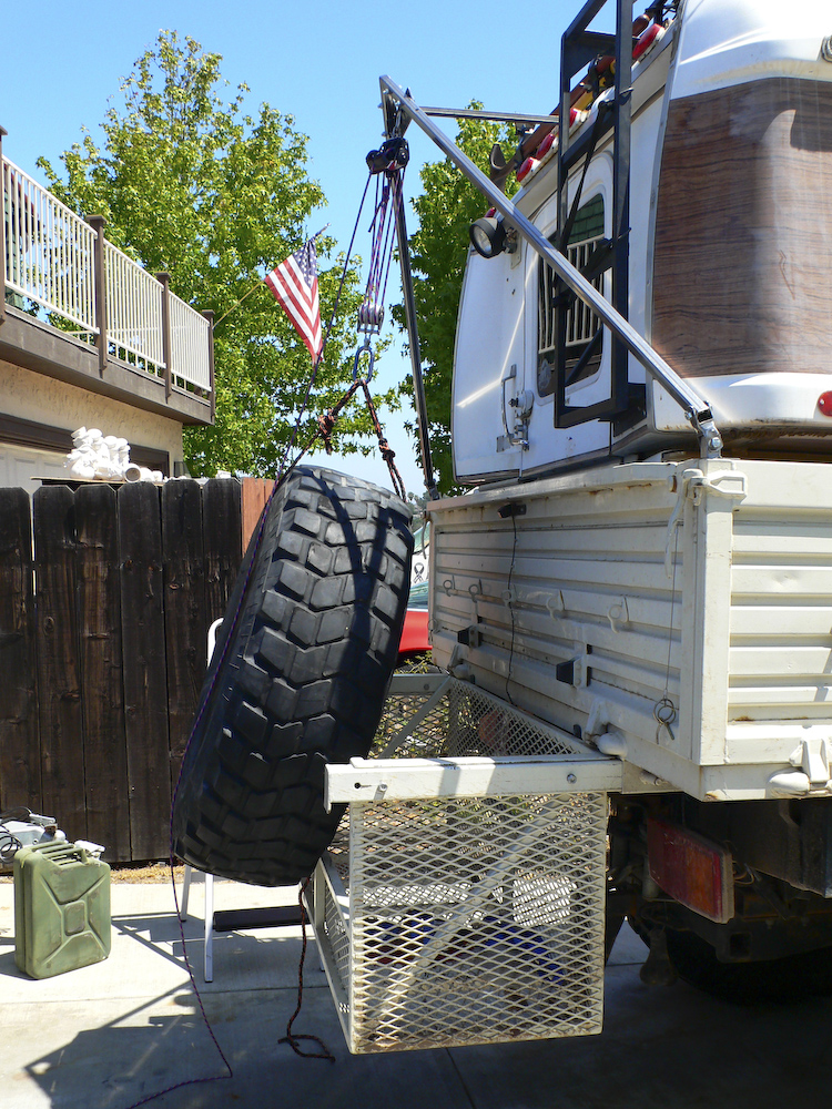 I built a very strong steel basket for the back of the truck to store extra cargo when the camper is mounted. The initial concept was to use the storage for my cooler and fire wood. The basket is plenty robust enough to hold the tire, but the problem is how do you get an awkward, 300 pound tire into the basket? Particularly if you are in rough terrain and the truck is off-camber.