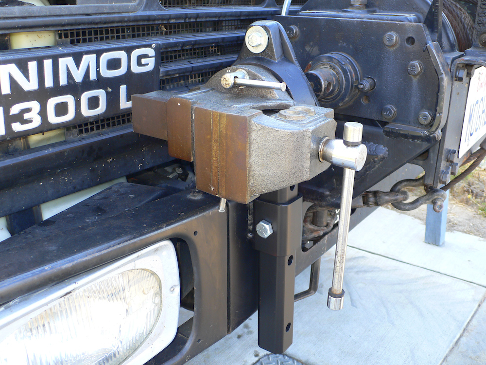 I took another small section of the 2 1/2" 1/4" wall tubing and welded it to the end of the front bumper. This allows me to easily move the vice to the alternate location. Plus, since the vice is on normal trailer hitch tubing, it can be plugged into another vehicle if required.