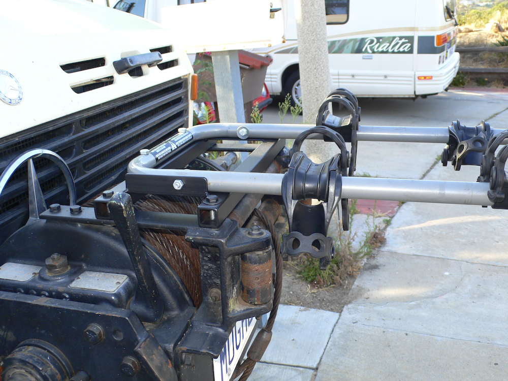 To provide an easy and secure mount for mountain bikes, I cannibalized Kathleen's Yakima rack that she used (once) on her 330 BMW. Then, I welded up a small mounting point that hooks to the front winch. The gray tubing is easily removable by taking out 4 bolts. The balance of the setup is more permanently attached and was not intended to be removed.