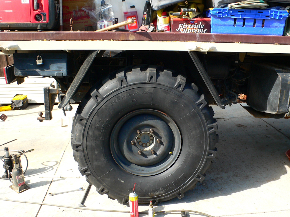 Completed rear axle with tires mounted. The jacks were removed and used for the front.